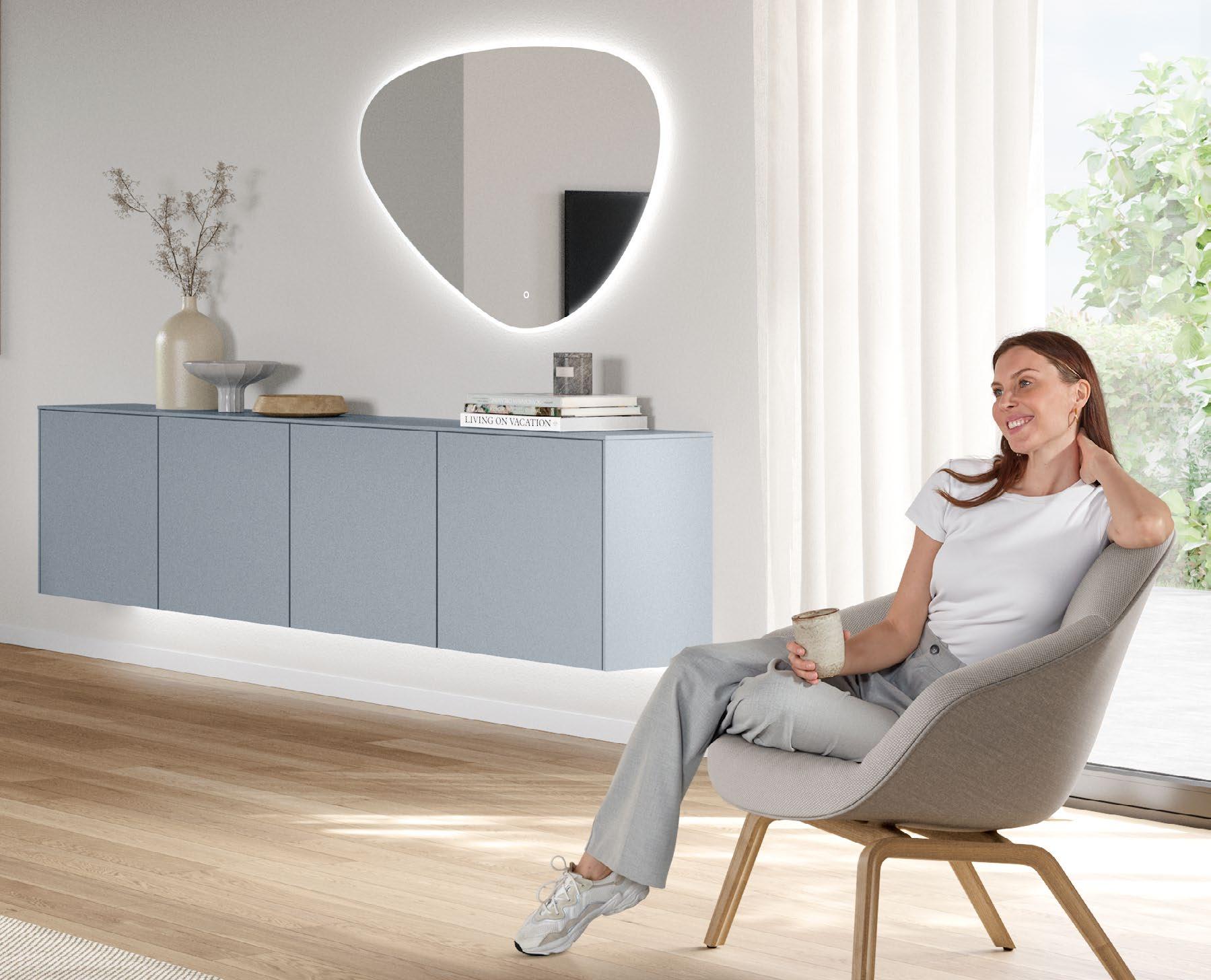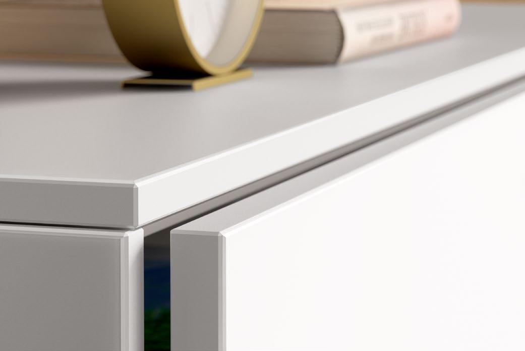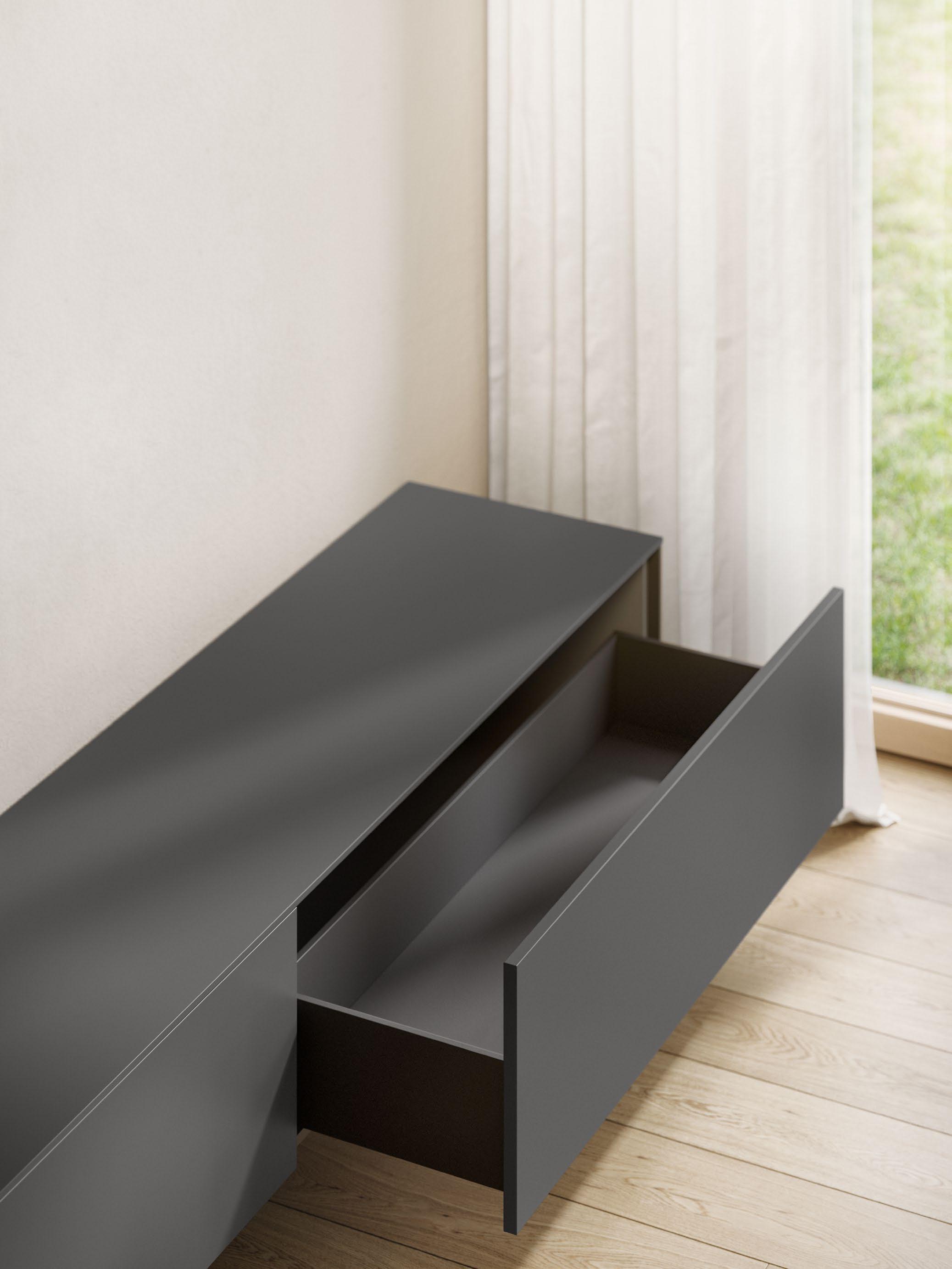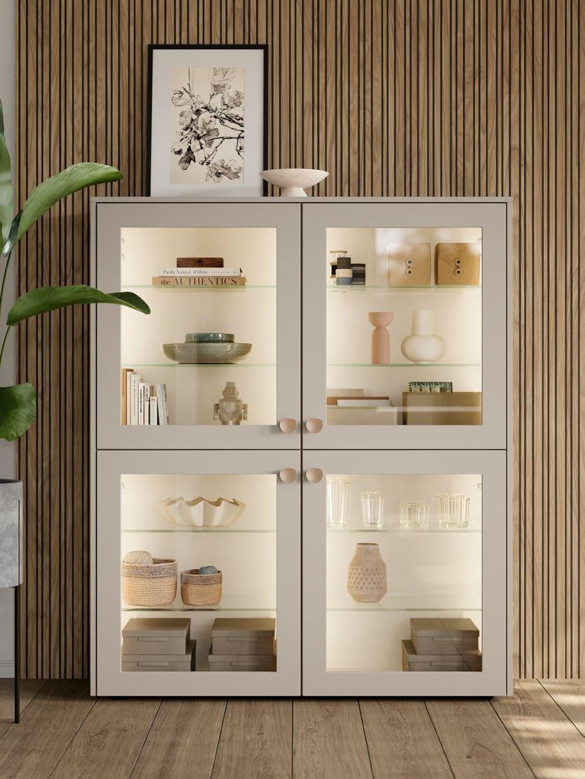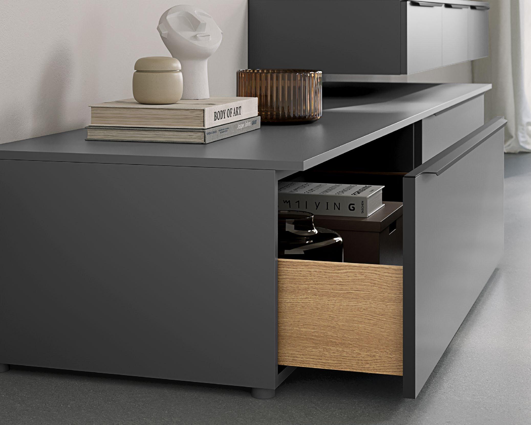 Oh, happy grey! Taupe grey creates a homely atmosphere and goes with just about anything. Discover an eye-catching item of your own, such as the free-standing glass cabinet with glass corners on both sides or media console with an indirectly illuminated media panel. Its cable opening makes all cables disappear visually.