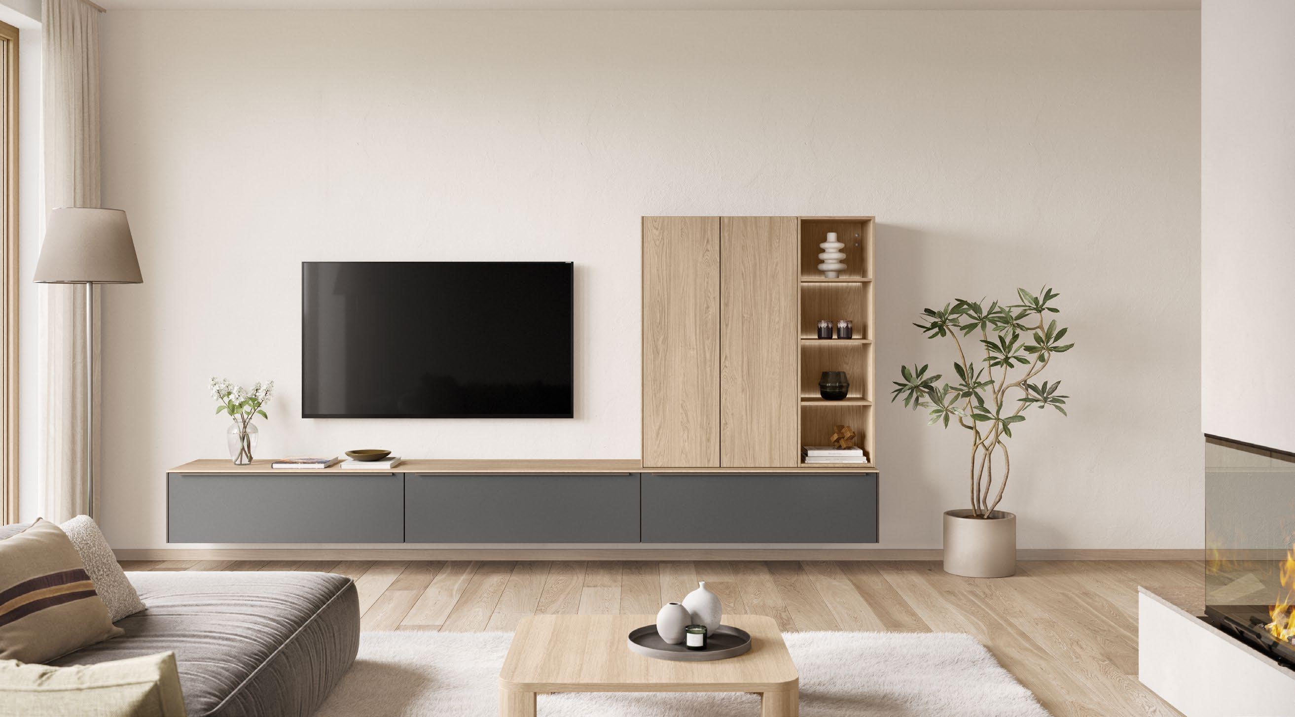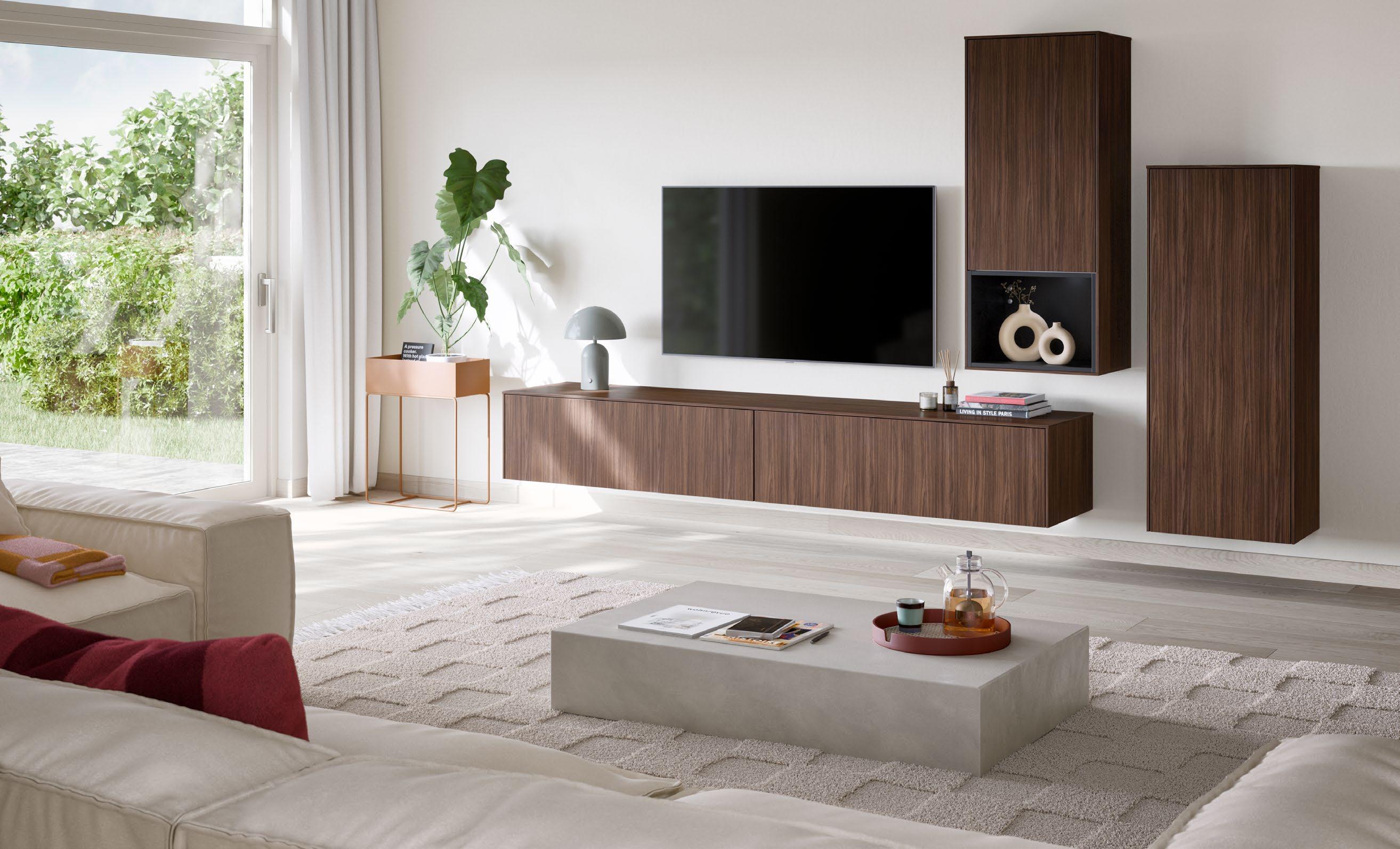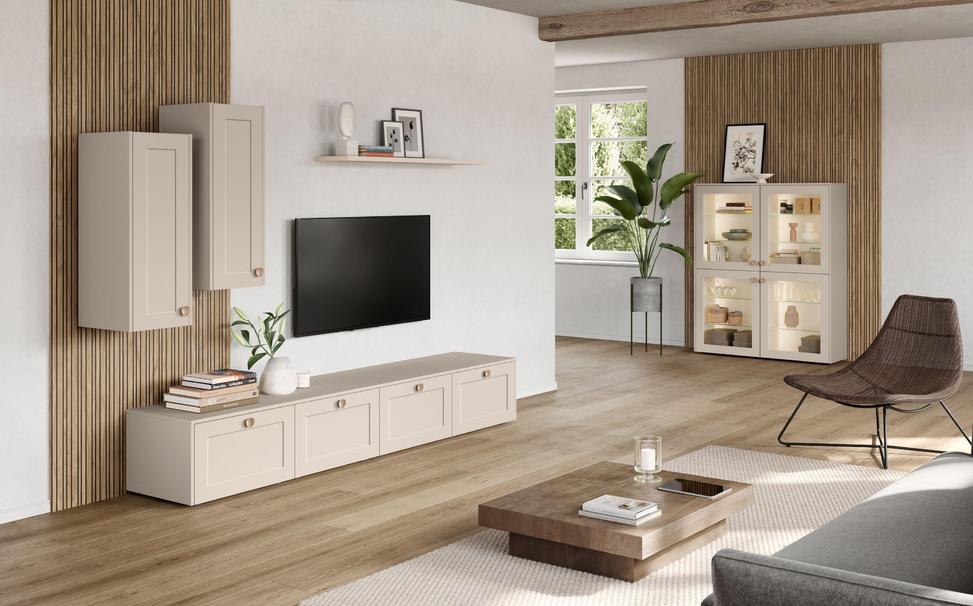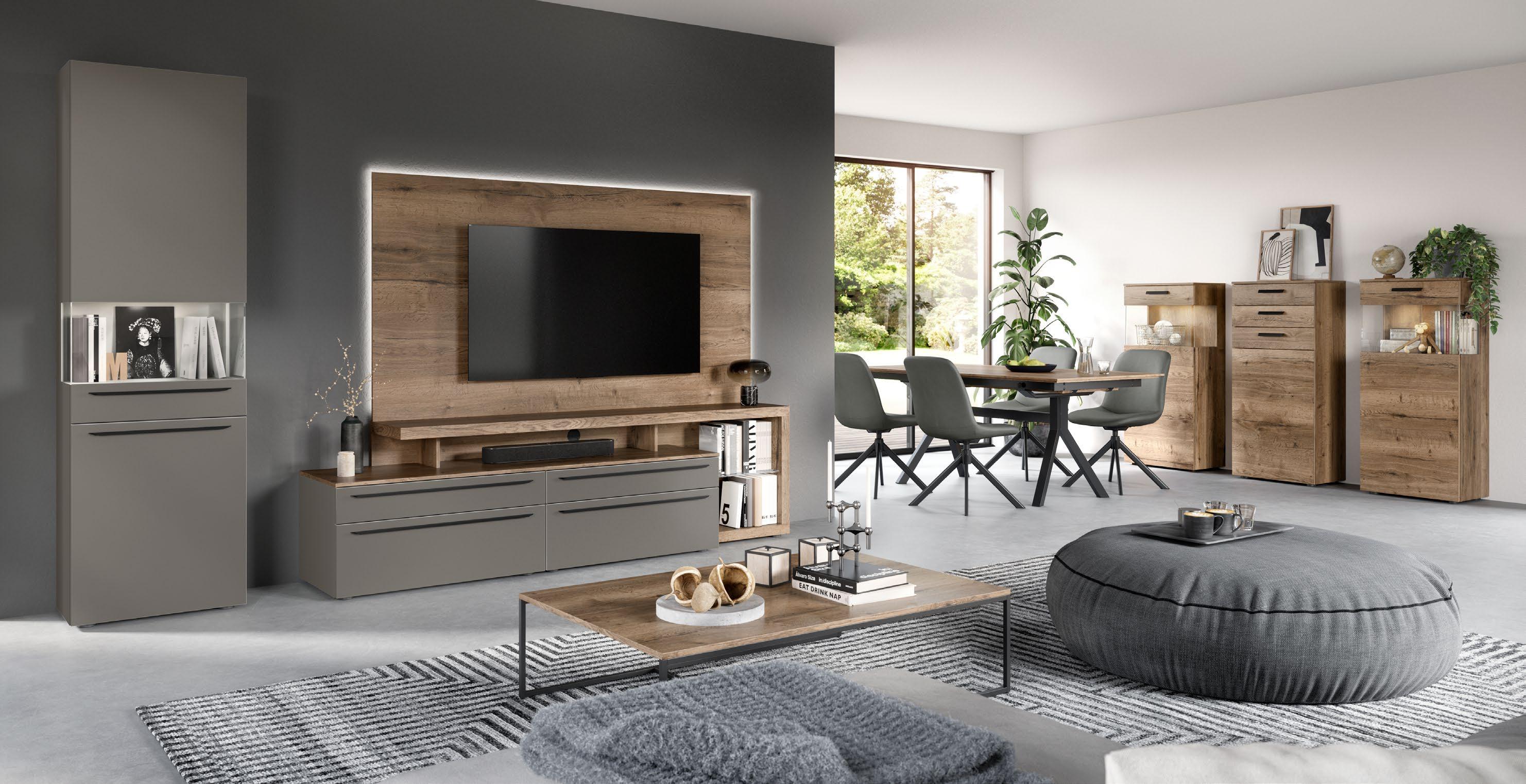 Taupe grey with walnut accents is a stylish design concept for everyone who loves a warm, elegant ambience. The shelf inserts spruce up the wall unit module. The media unit raises the TV and conceals all the cables, whilst the integrated lighting creates a pleasant atmosphere.