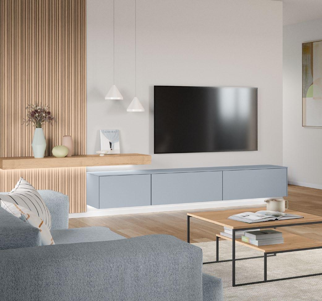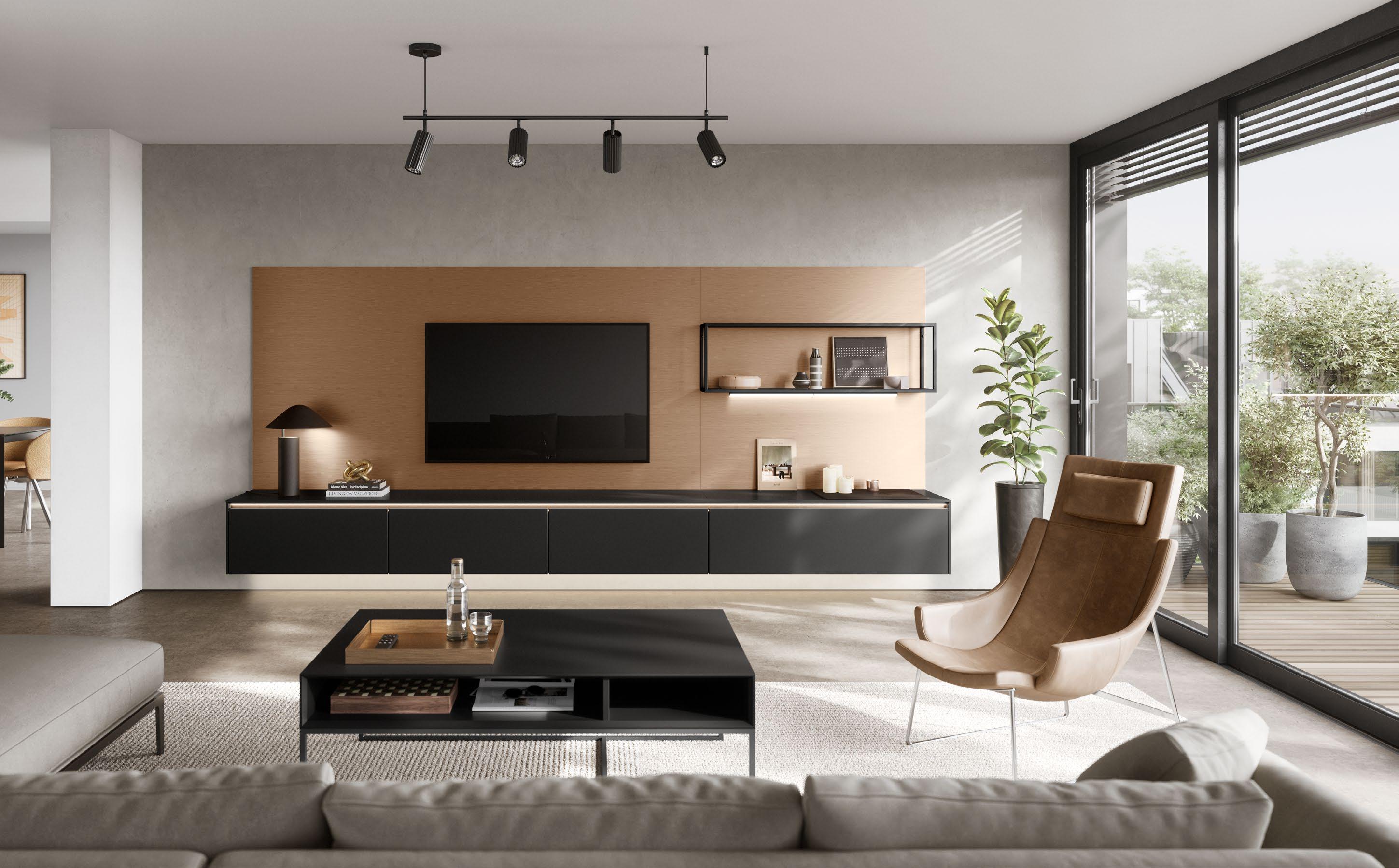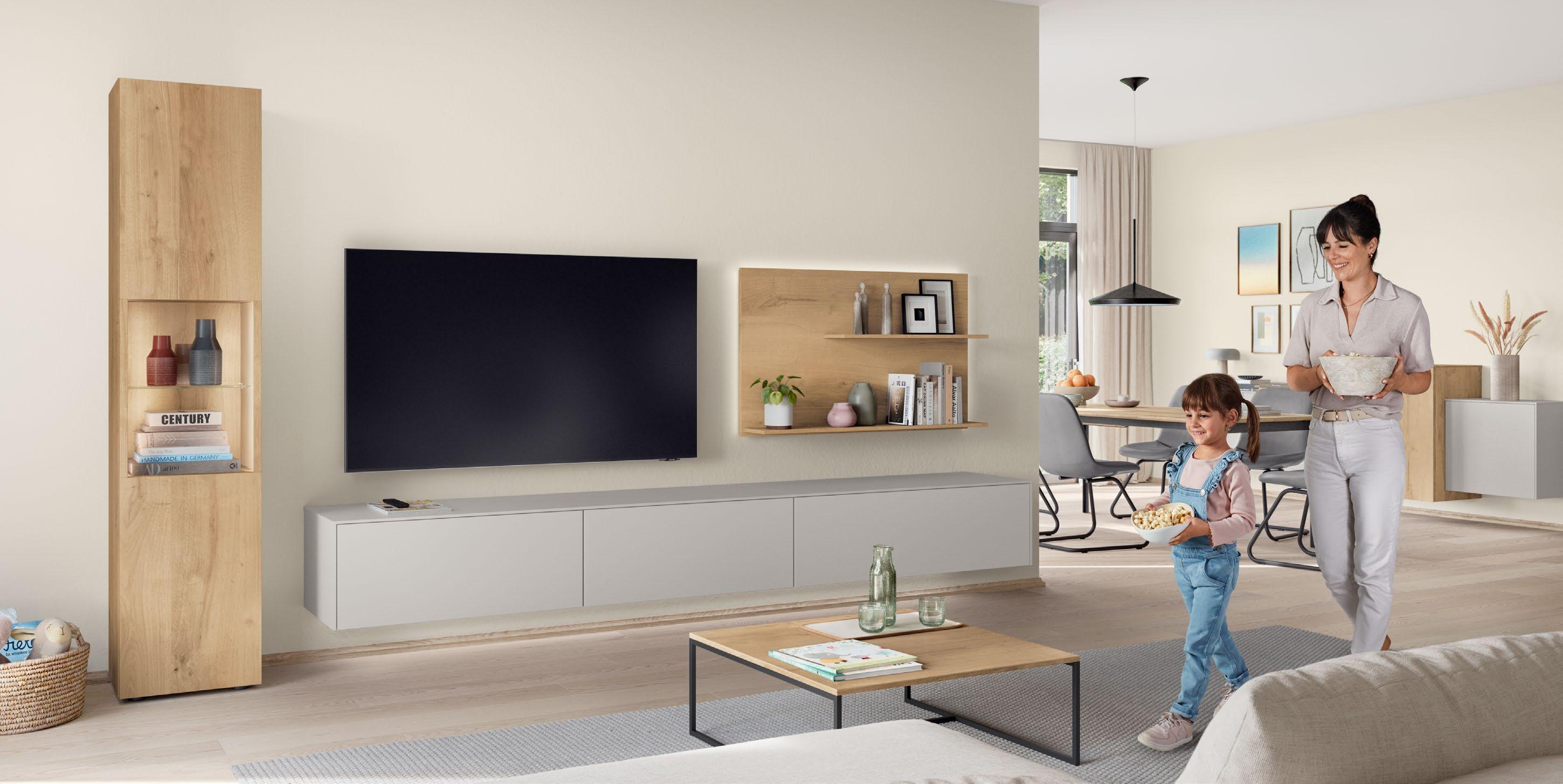 Taupe grey with walnut accents is a stylish design concept for everyone who loves a warm, elegant ambience. The shelf inserts spruce up the wall unit module. The media unit raises the TV and conceals all the cables, whilst the integrated lighting creates a pleasant atmosphere.