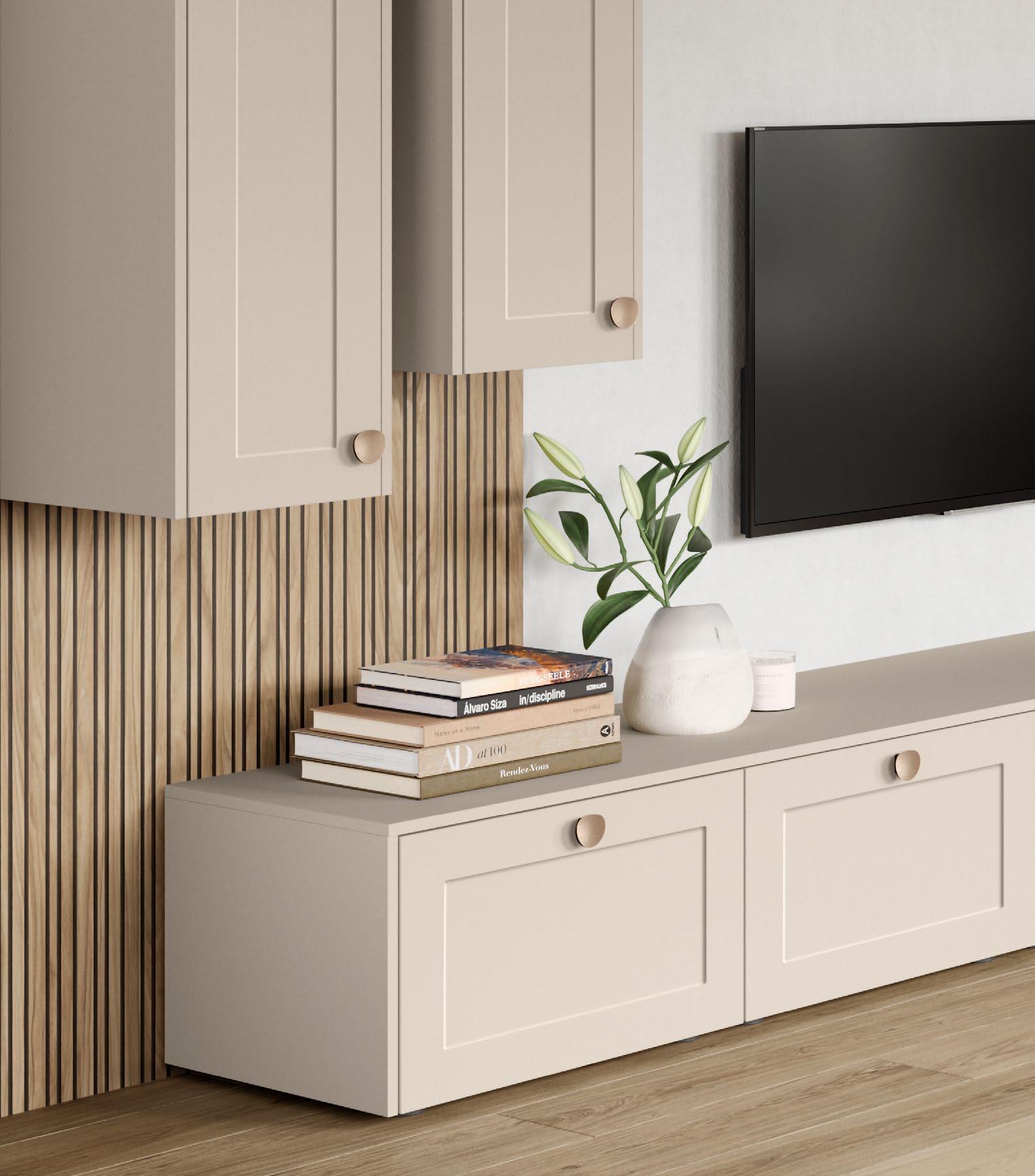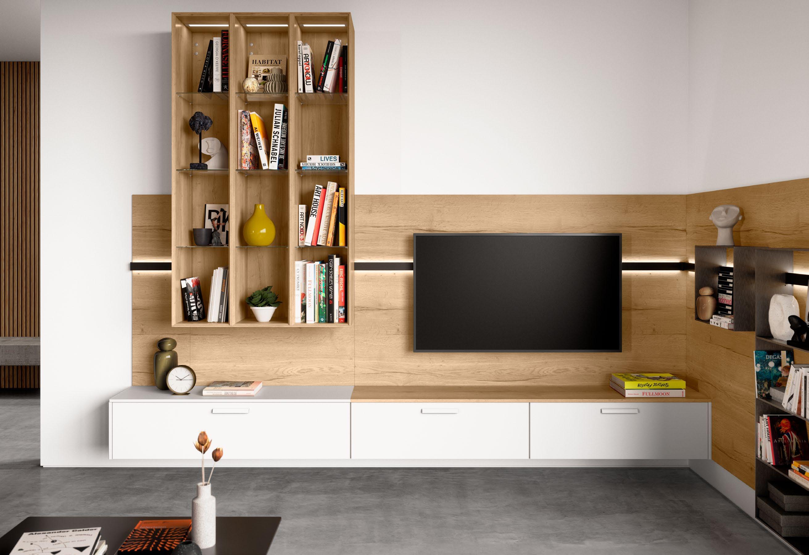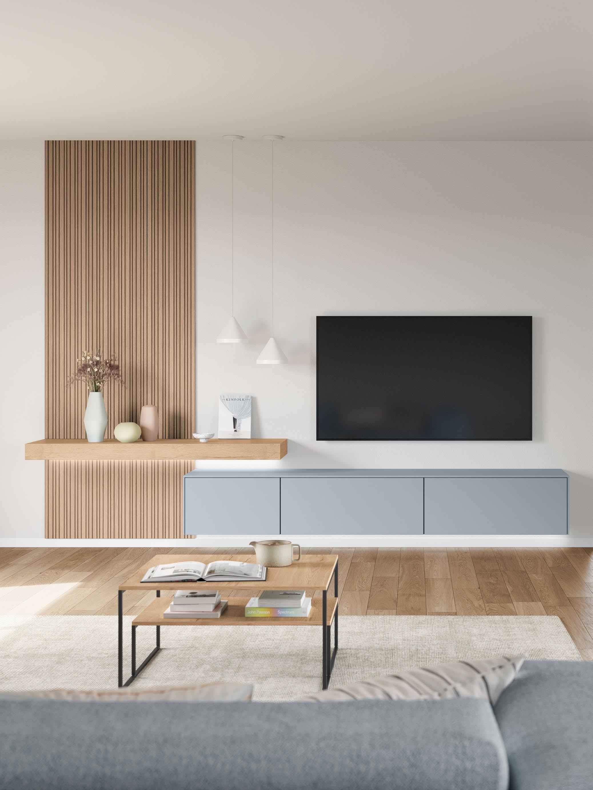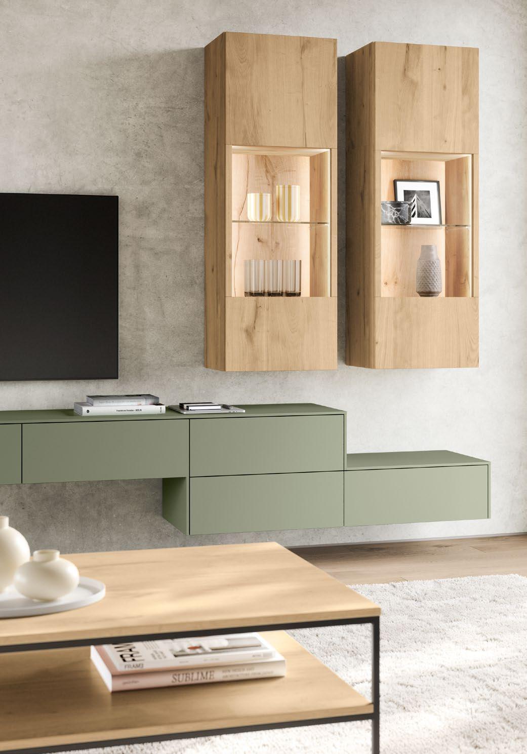 Taupe grey with walnut accents is a stylish design concept for everyone who loves a warm, elegant ambience. The shelf inserts spruce up the wall unit module. The media unit raises the TV and conceals all the cables, whilst the integrated lighting creates a pleasant atmosphere.