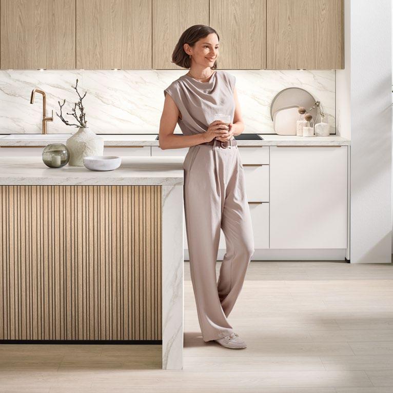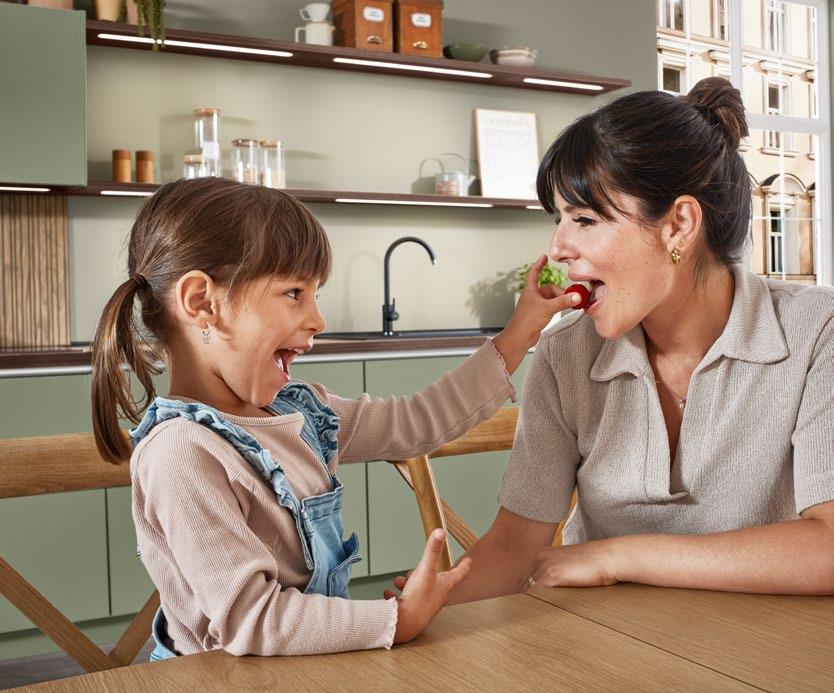 This is where laughter fills the room! Modern grey tones and natural materials increase the level of comfort and well-being for the entire family. The easy-care anti-fingerprint surface of the satin grey fronts is especially practical for everyday life with children. An elegant ambience that lends itself to cherished memories.