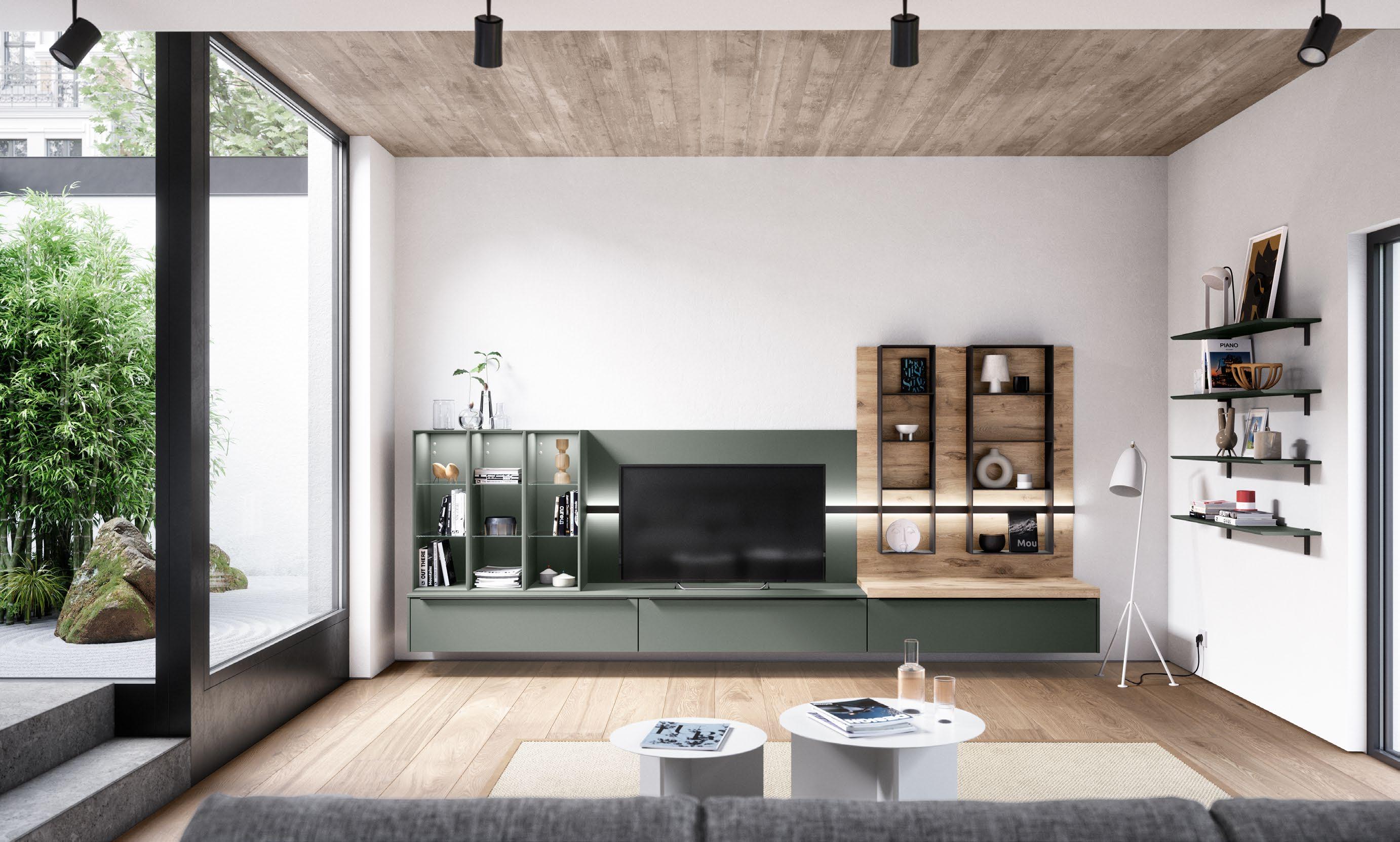 Das Leben zu Hause kreativer gestalten! Das Zusammenspiel aus geschlossenen und offenen Elementen wirkt ausgesprochen ästhetisch, besonders durch das elegante Lowboard in der Trendfarbe Koralle. Vielseitig und offen für Dekoratives: ein großzügig geplantes Regalsystem aus schwarzem Stahl mit integrierter Beleuchtung für außergewöhnliche Lichteffekte.