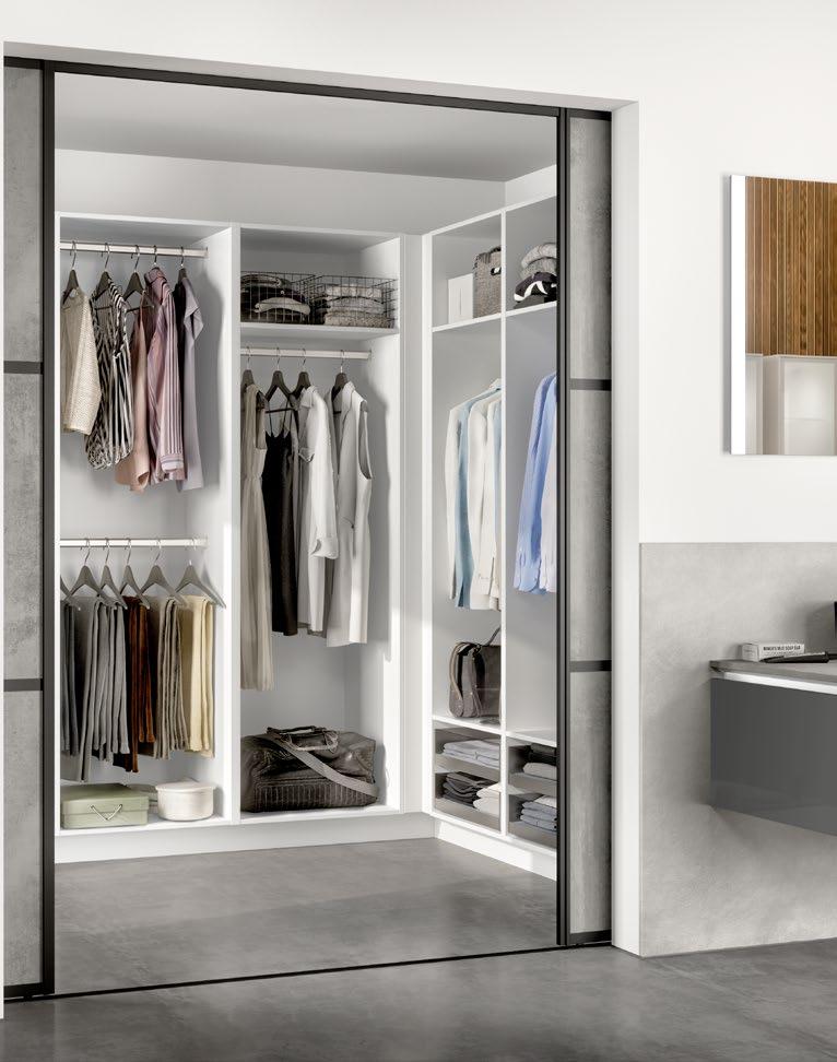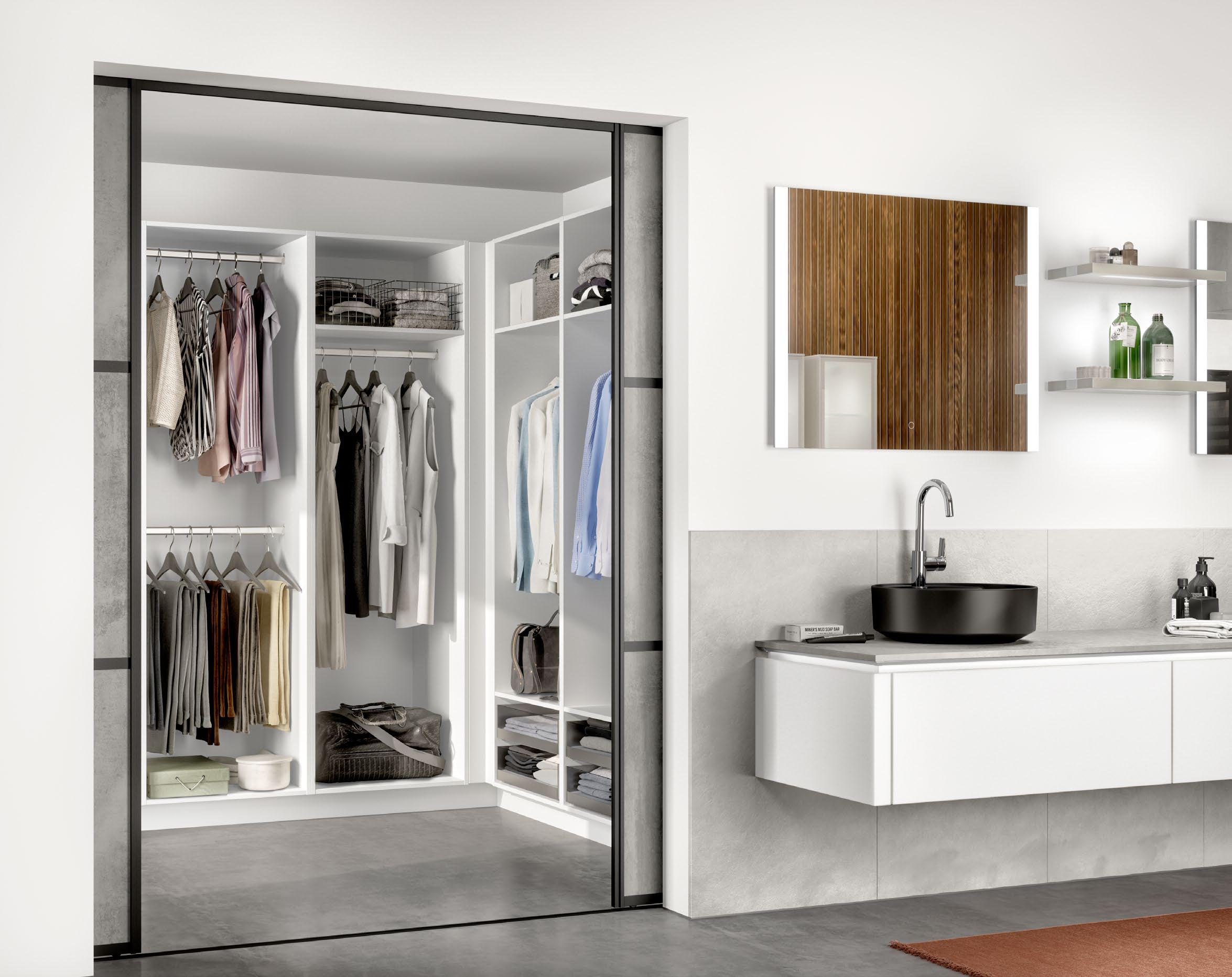 Sie lieben es harmonisch und komfortabel? Dann gestalten Sie Bad und Ankleide zu einem ganzheitlichen Wohlfühl erlebnis. Hinter großzügigen Gleittüren verstecken sich offene Garderobenschränke mit einem durchdachten Innenleben.