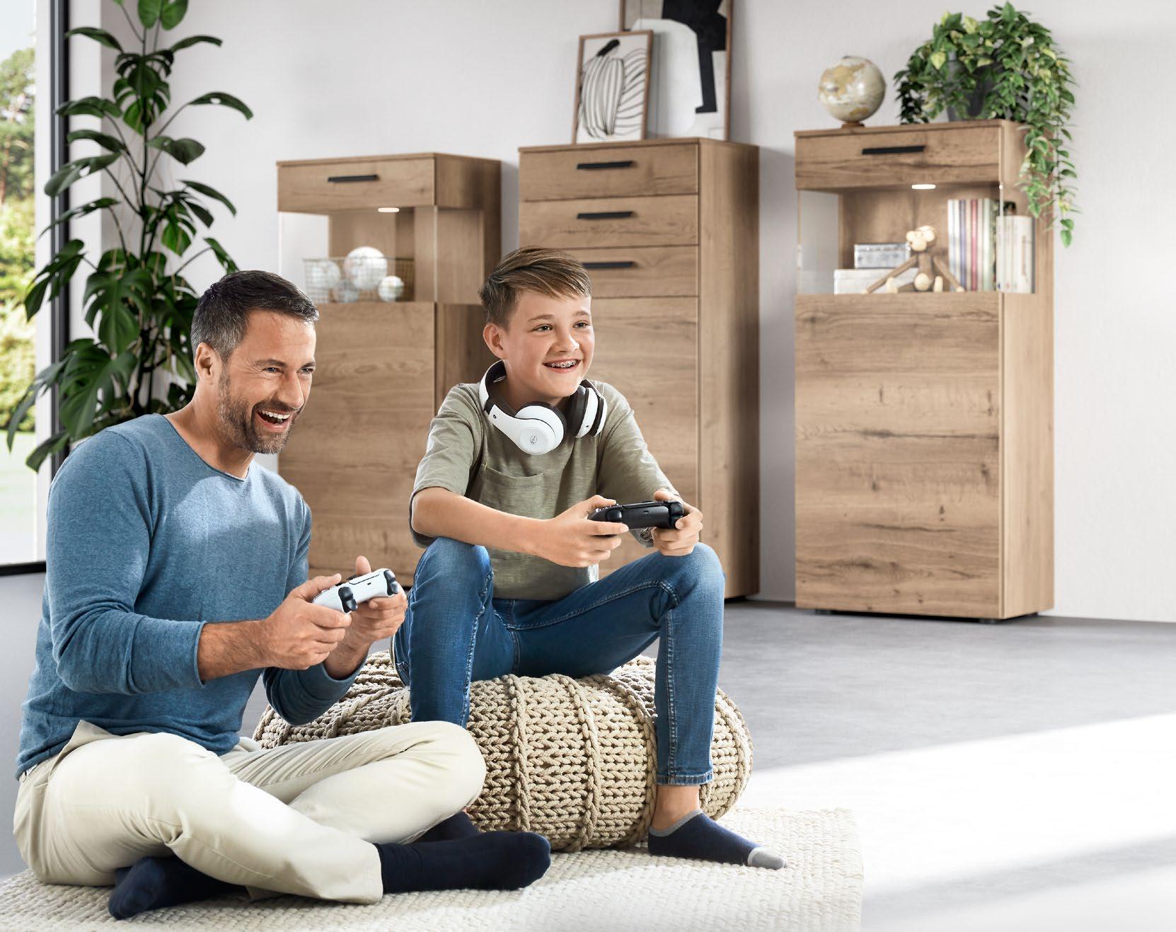Glass cabinets, media boards and lowboards are the central elements for a stylish and functional living room! Fronts in premium honed alpine white combined with wood tones create an inviting atmosphere. Our glass cabinets in Sierra oak reproduction with lighting make evenings all the more atmospheric and are an absolute must.