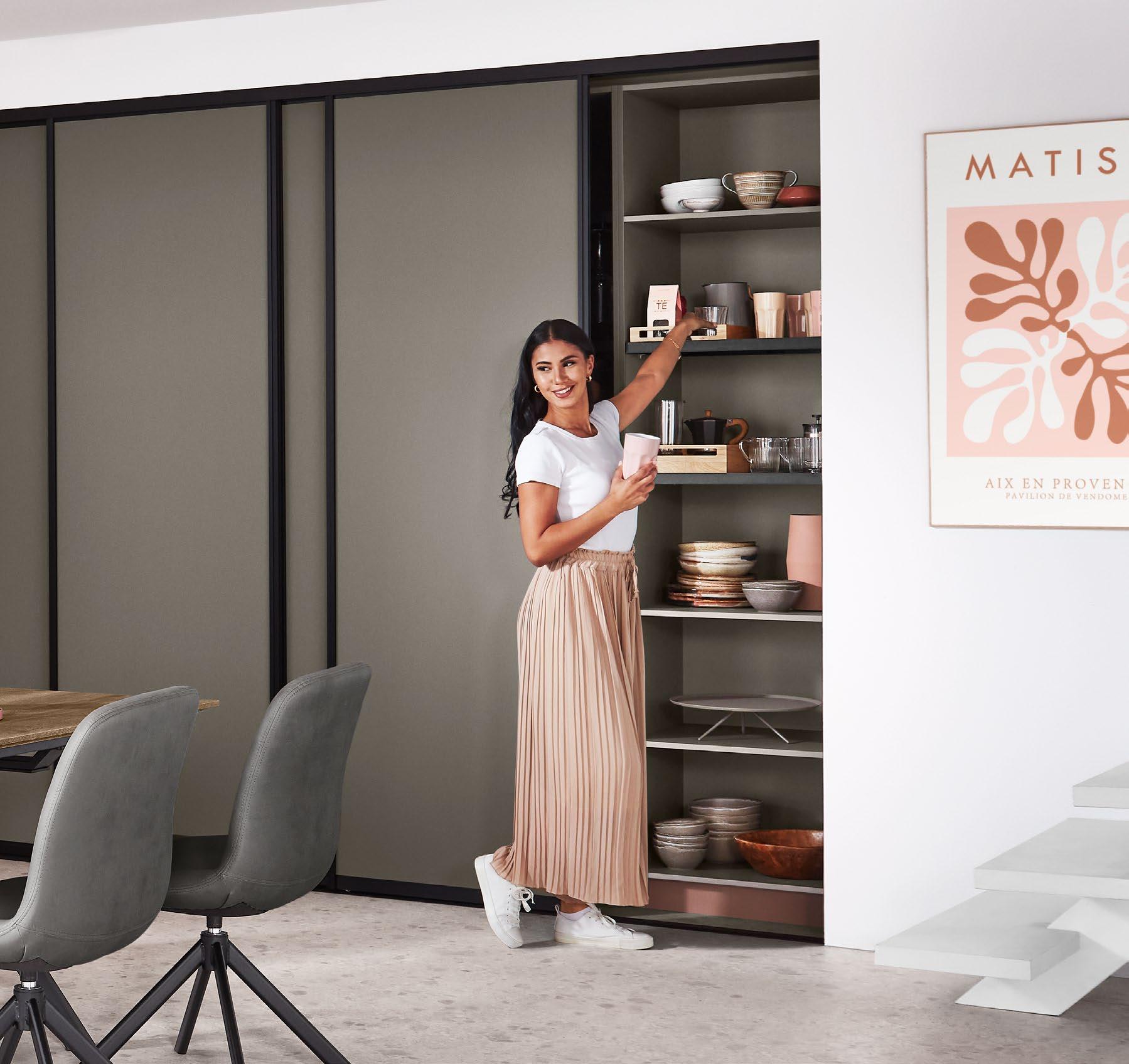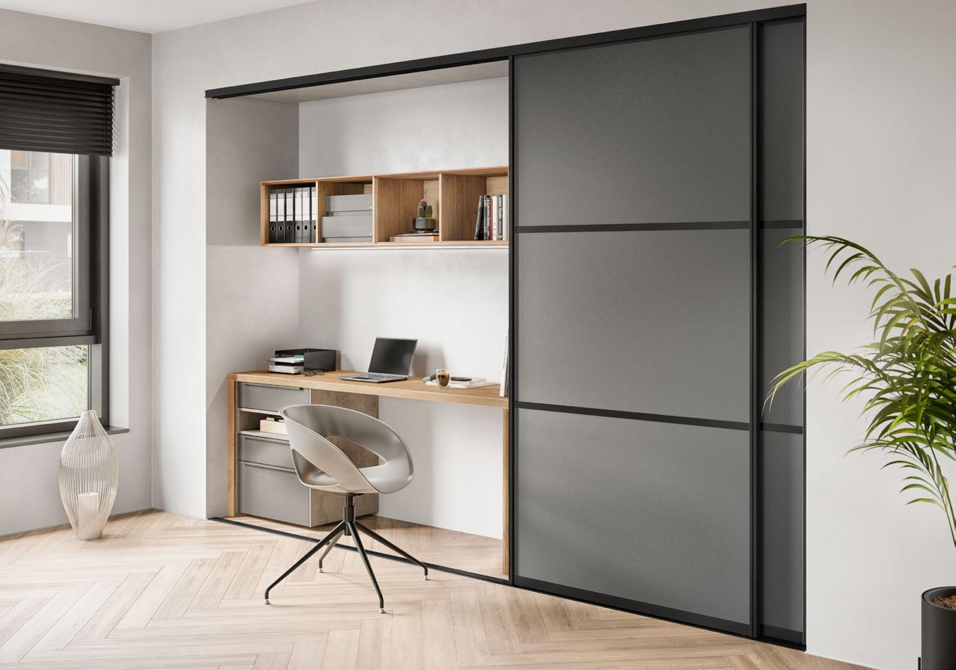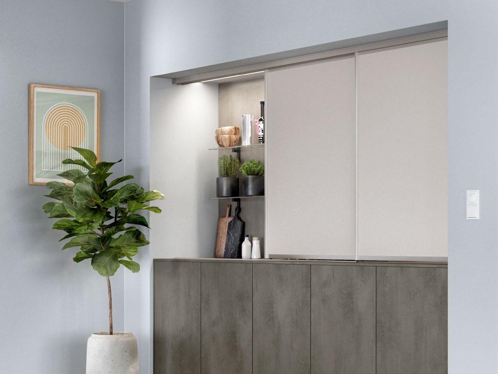 Gleittüren trennen angrenzende Räume wie die Ankleide oder den Hauswirtschaftsraum ganz einfach ab oder lassen das Homeoffice im Bruchteil einer Sekunde verschwinden.