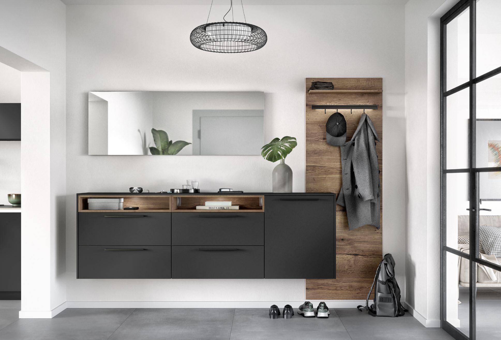 Ein elegantes Willkommen. Das schwebende Sideboard in ultramattem Schwarz mit Ton-in-Ton-Griffen wird ergänzt durch das Wandsteckbord im Eiche-Look. Kombinieren Sie dazu einen großformatigen Spiegel, der sich harmonisch einfügt.