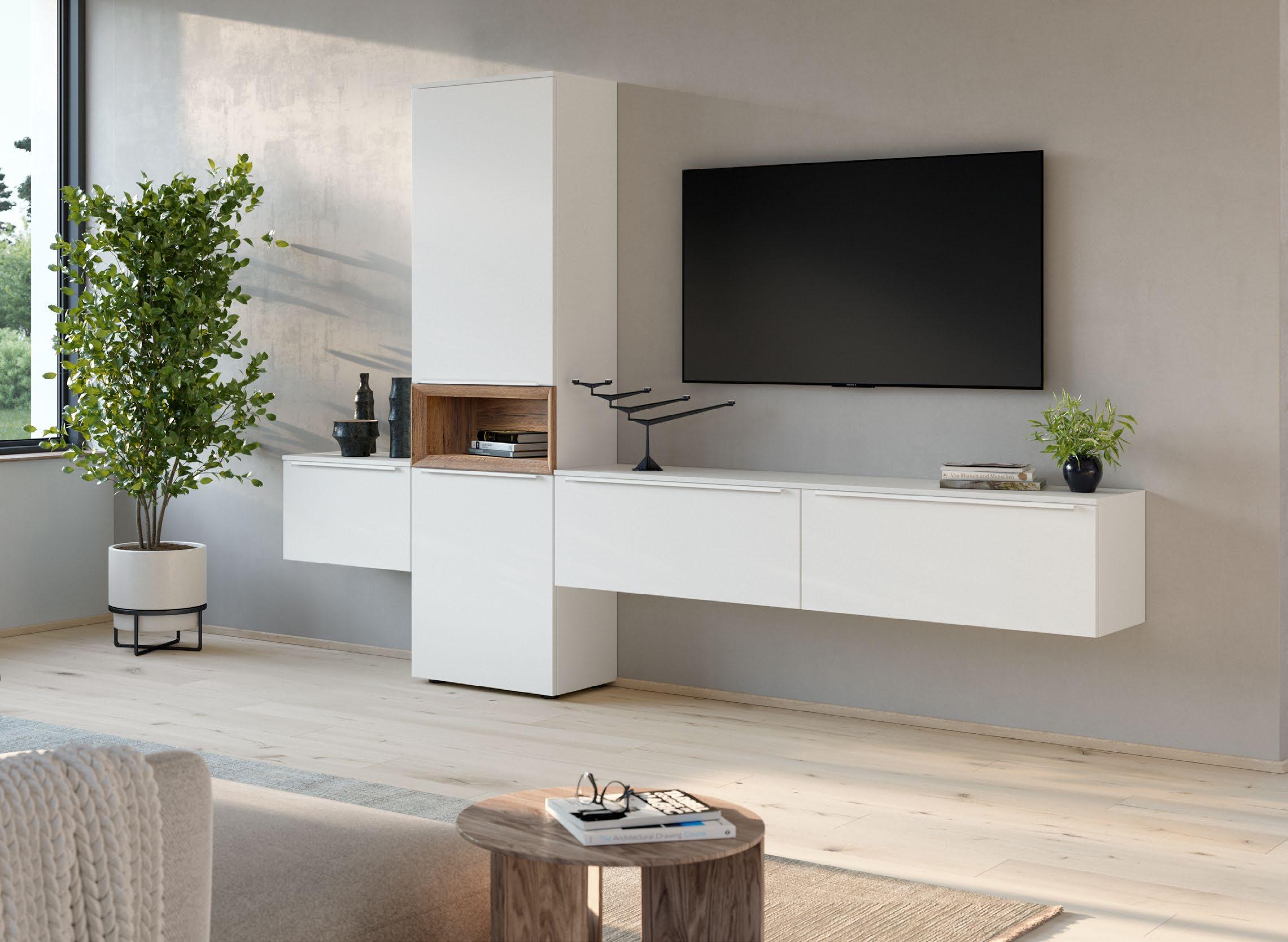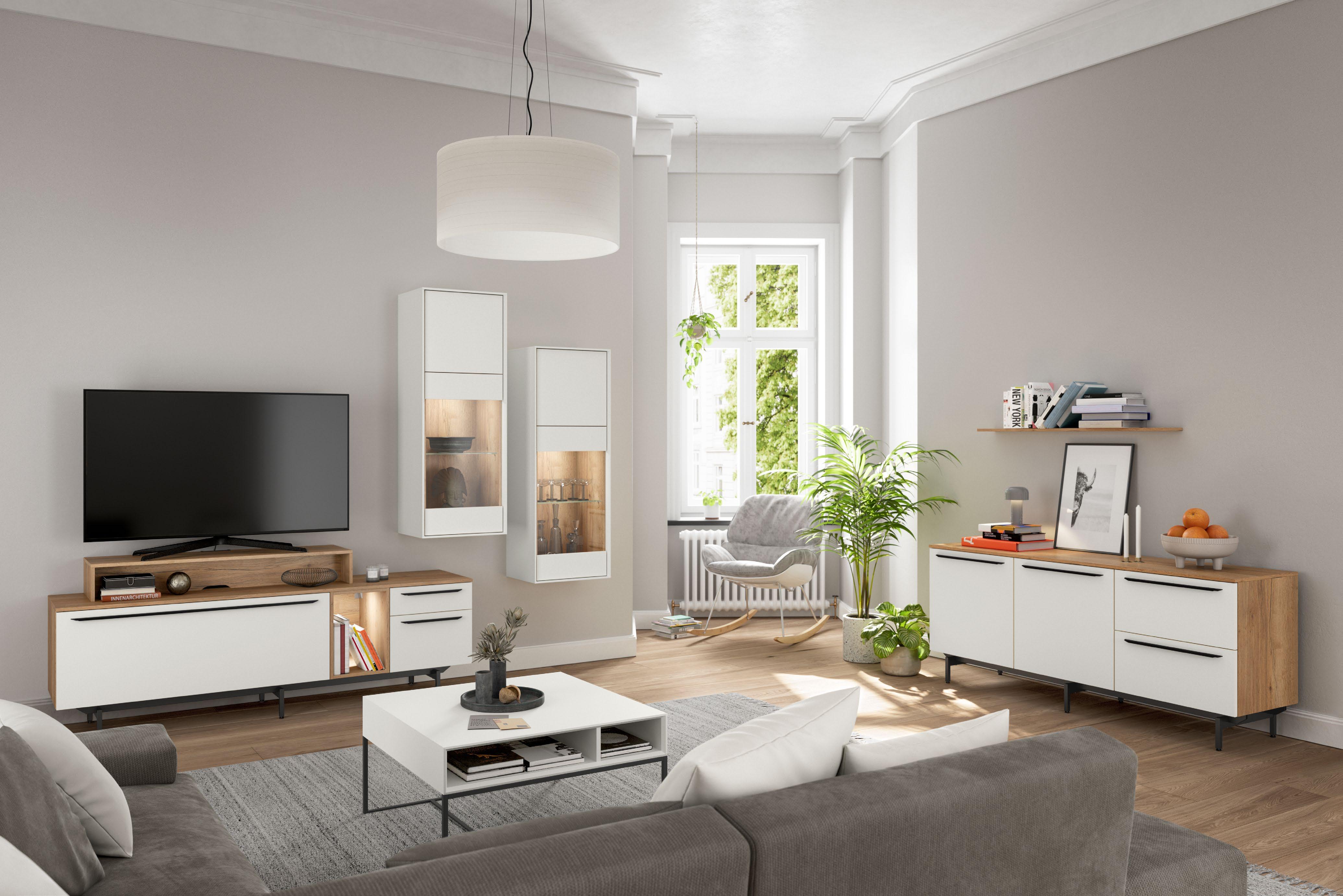 Ein kreatives Design verleiht Ihrem Wohnraum Charakter und Eleganz! Weiße Sideboards verbunden mit einem hohen Schrankelement sind ein optisches Highlight und strukturieren den TV-Bereich. Der Regaleinsatz Case im warmen Holzton Eiche Havanna Nachbildung zieht dabei die Blicke auf sich.