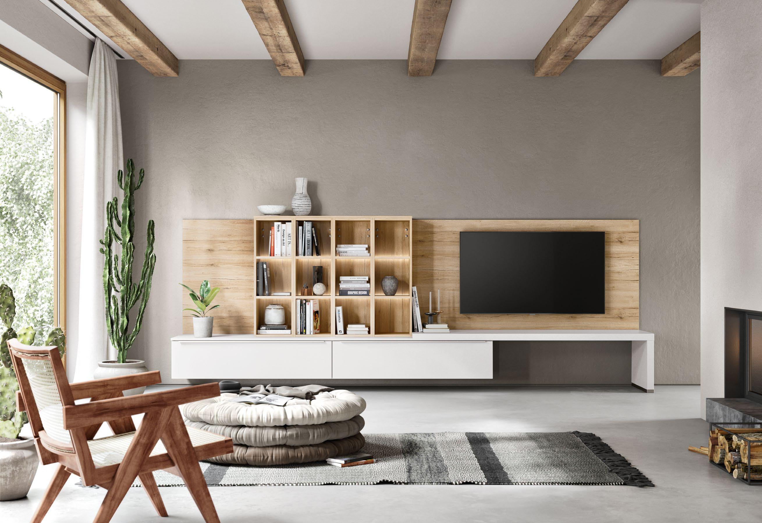 A creative design brings character and elegance to your living space! White sideboards in combination with a high cupboard element are a visual highlight and provide structure to the TV area. All eyes will be on the shelf insert Case in its warm Havana oak reproduction wood tone.