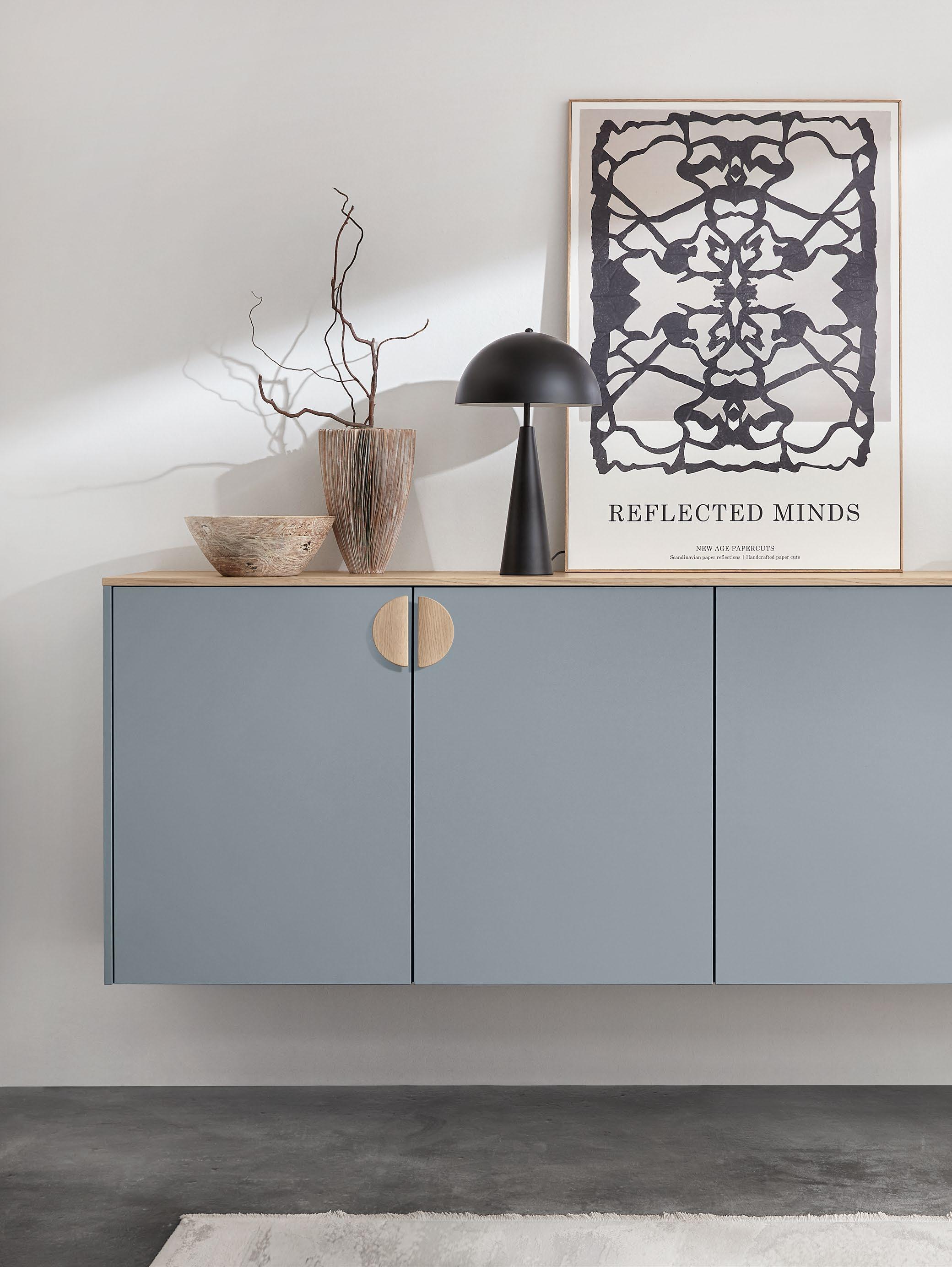 An elegant welcome. The floating ultra matt black sideboard with handles in similar shades is complemented by a plug-in wall shelf in an oak look. Combine it with a large mirror that blends in harmoniously.