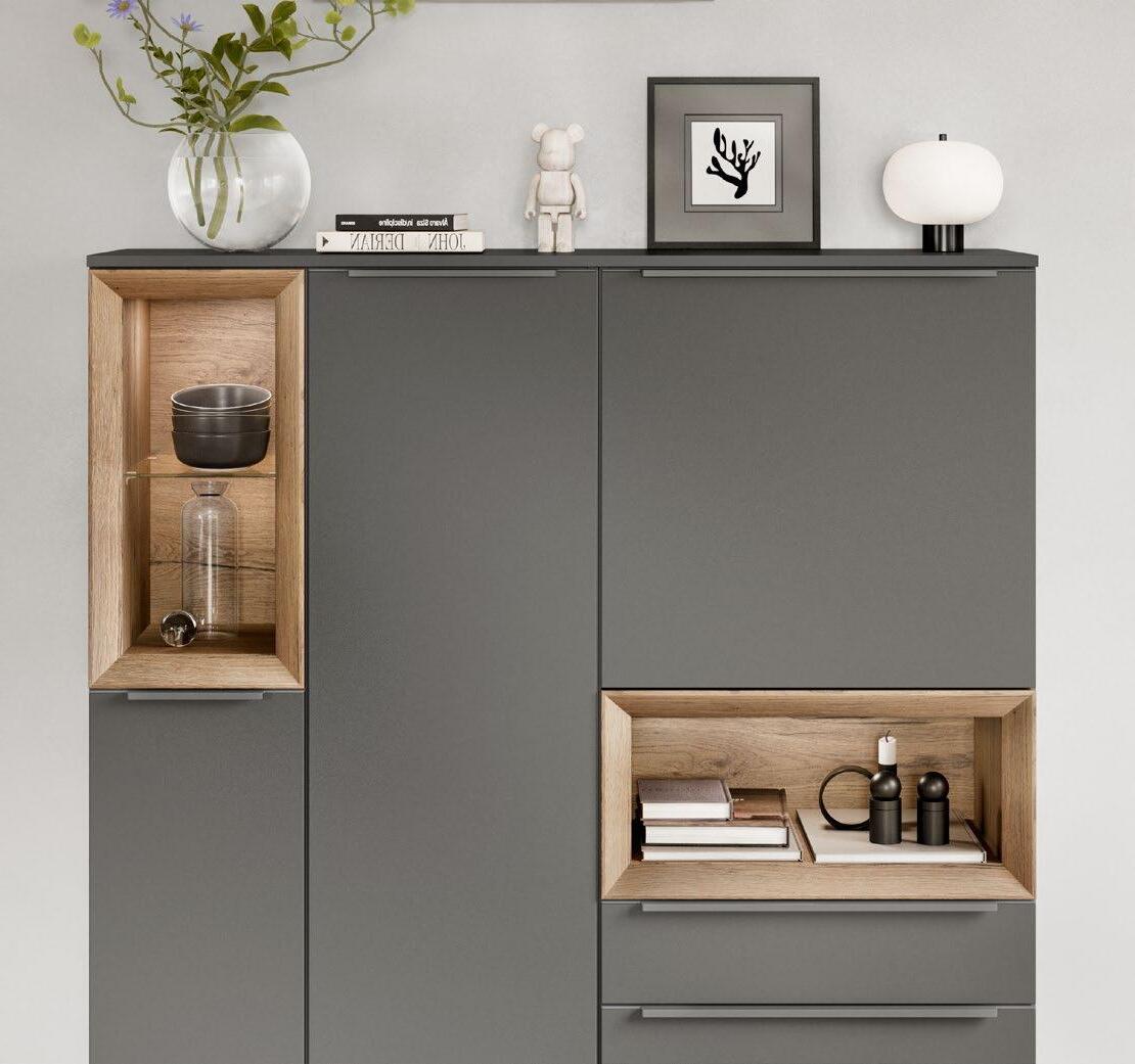 Oh, happy grey! Taupegrau wirkt wohnlich und lässt sich vielseitig kombinieren. Entdecken Sie Ihren ganz persönlichen Blickfang, z. B. die SolitärVitrine mit beidseitiger Eckverglasung sowie die Medienkonsole mit indirekt beleuchtetem Medienpaneel. Hier lässt der Kabeldurchlass jetzt optisch alle Kabel verschwinden.