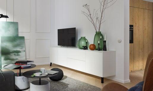 2 The two-door buffet cabinet fits seamlessly into the run of tall units and offers valuable storage space. The back panel comes standard with an integrated double socket. Optional accessories like LED lighting, glass shelves and pull-out shelves make this design even more convenient and the ambiance even more cosy.