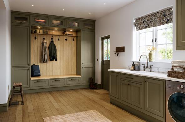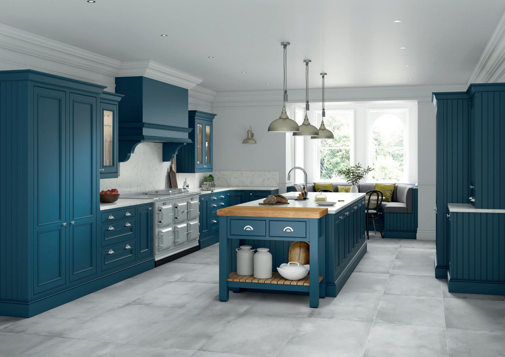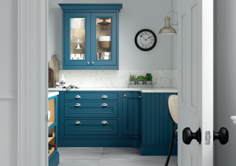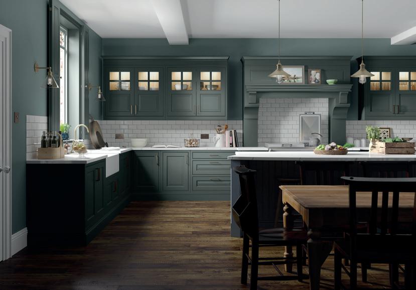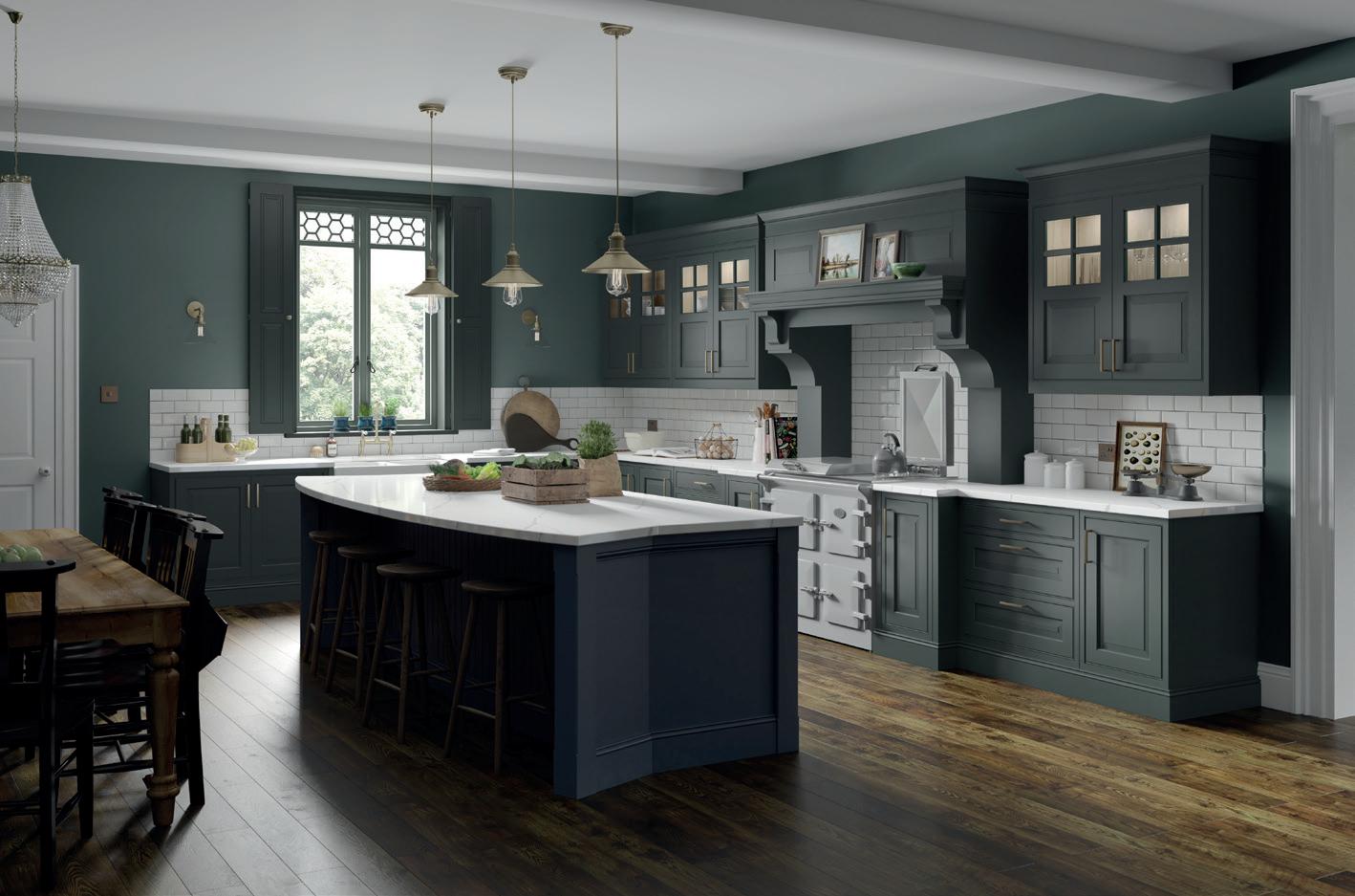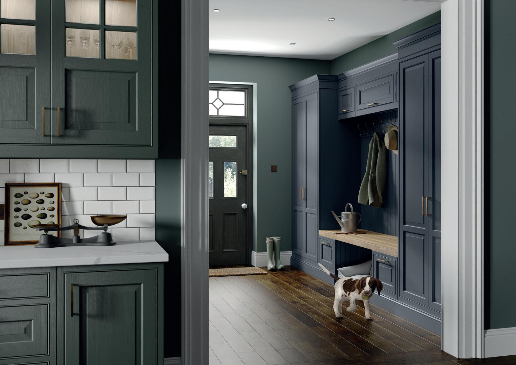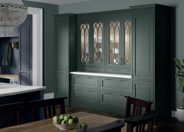 Wall units are painted Heritage Green and are contrasted with Slate Blue on the elegantly curved island and spacious bootroom, which incorporates a special place for the family pooch. The fridge and larder stand either side of a glazed dresser with ornate Gothic frames.