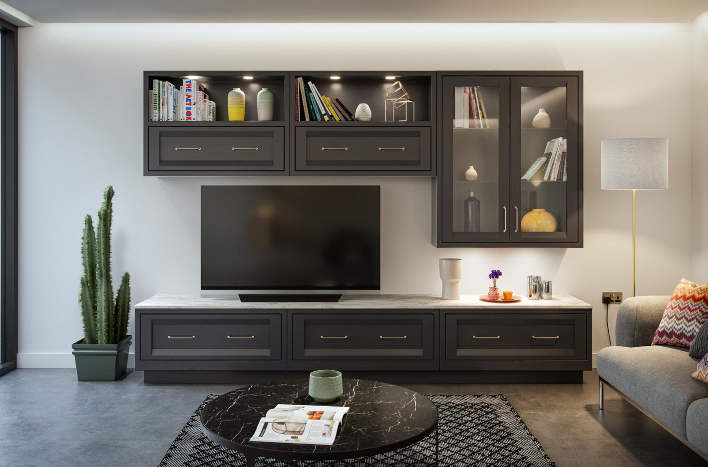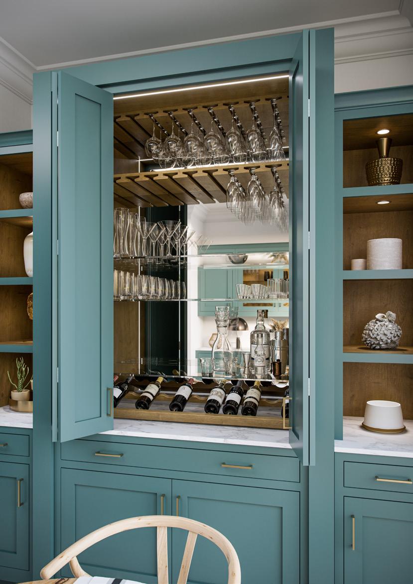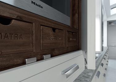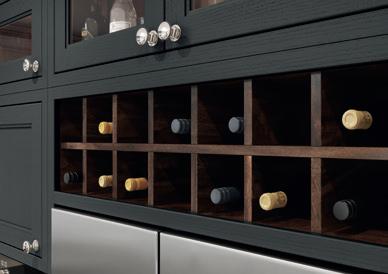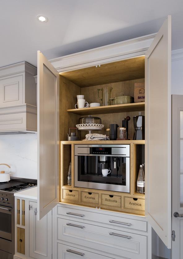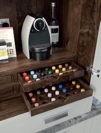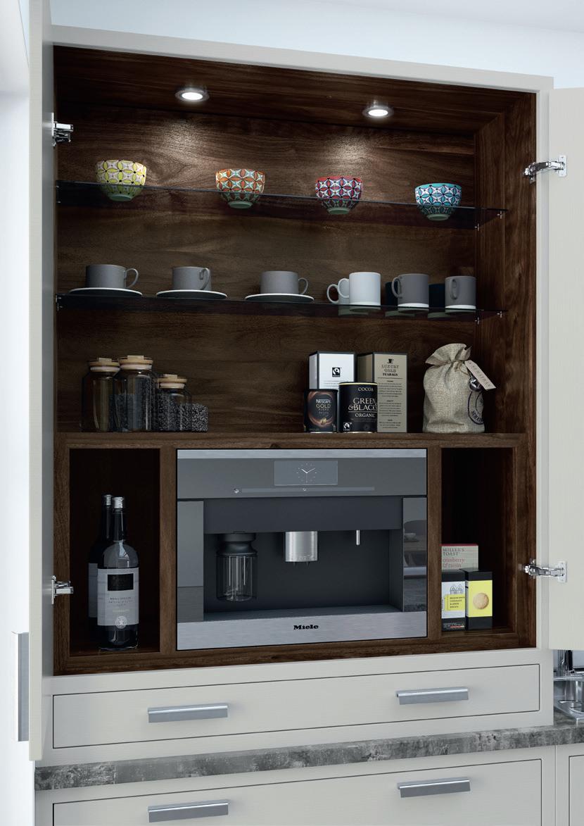 Stunning hand-crafted walnut internals create a striking contrast to the Light Grey cabinets. Options such as coffee pod drawers or carved dovetail drawers will provide the finishing touches to your luxury coffee station.