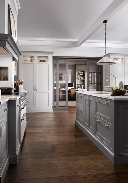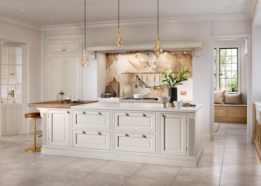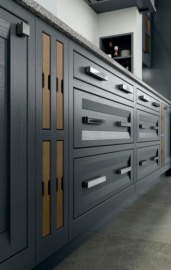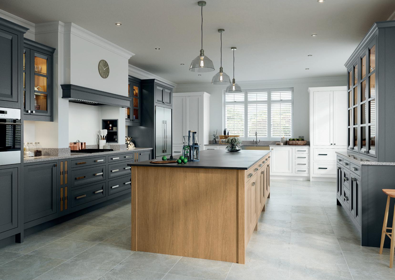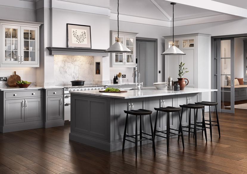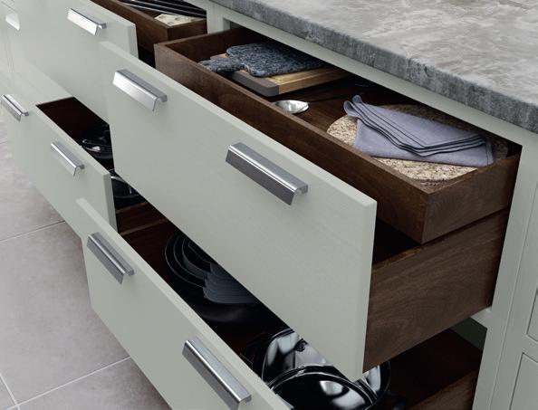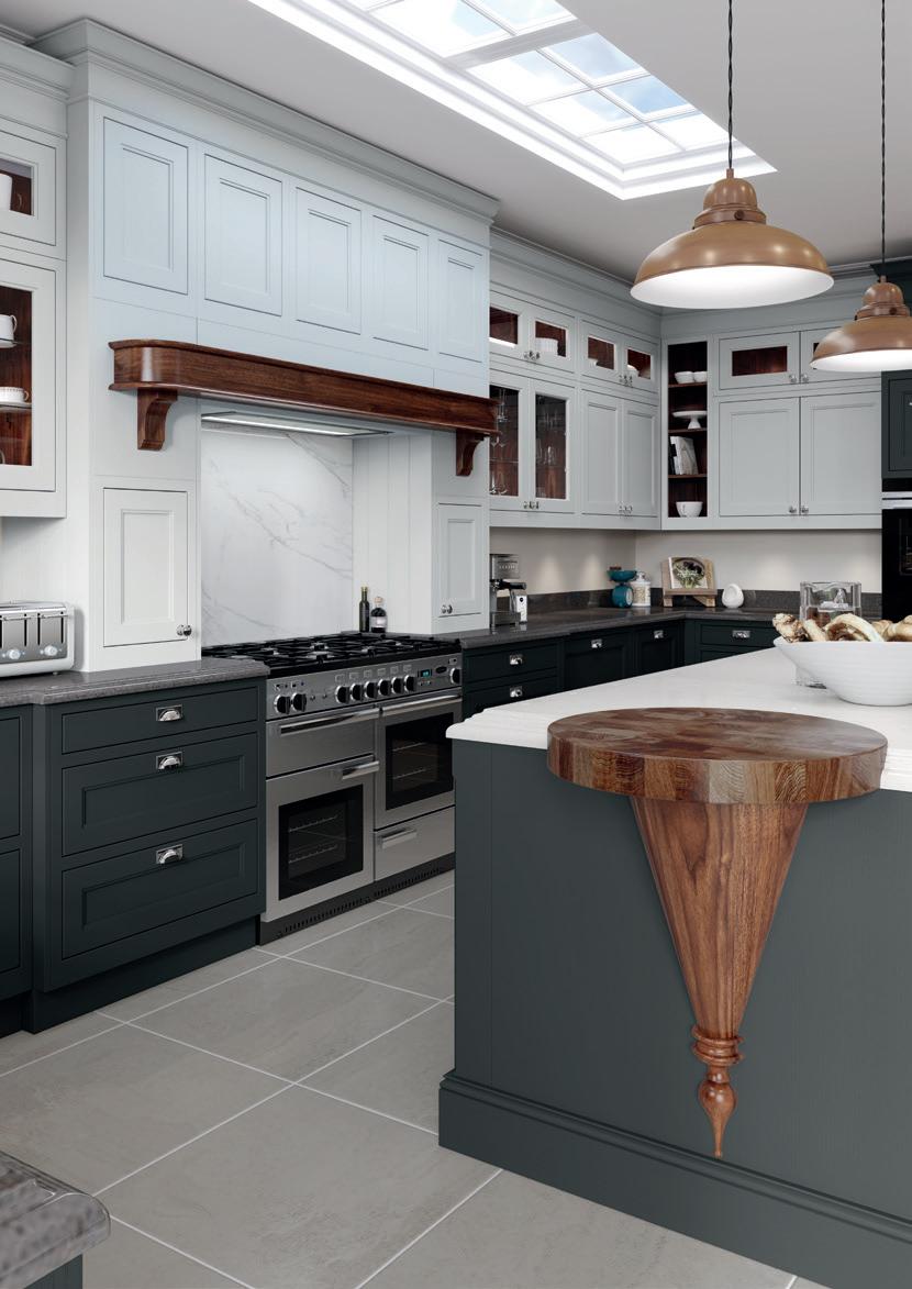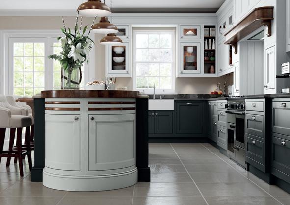 The kitchen shown here features Sutton painted Shell and Gun Metal Grey. The rich, luxurious Walnut finish used for several of the accessories contrasts exquisitely with its painted surroundings.