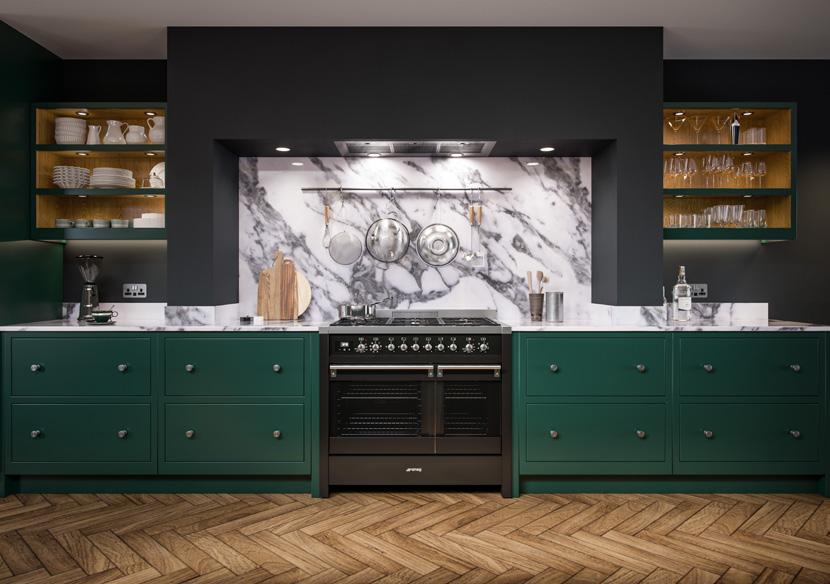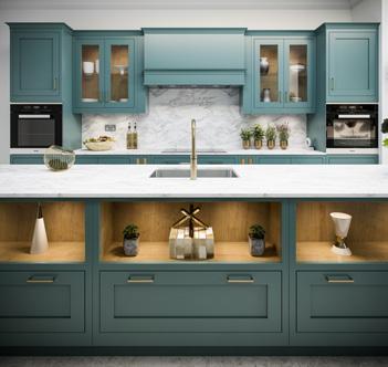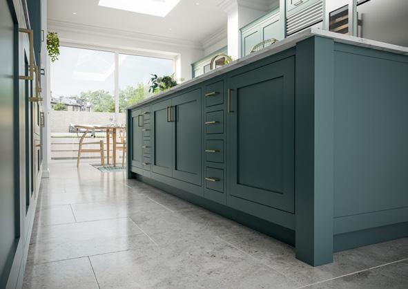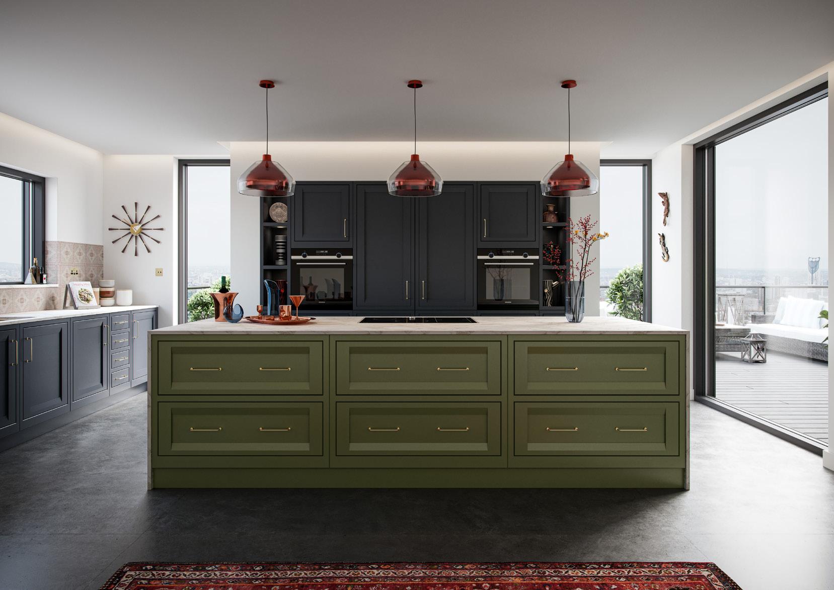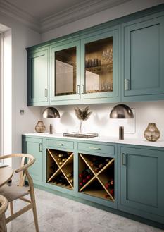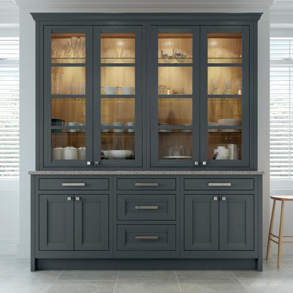 A more contemporary example of Regent with wall units in Stone and a magnificent Forest Green island which boasts seating on two sides, door end panels and chamfered pilasters. The dresser featuring open shelving in White Oak, nestles between the tall units to add a decorative yet functional element in this modern kitchen.