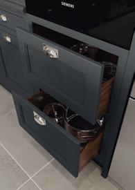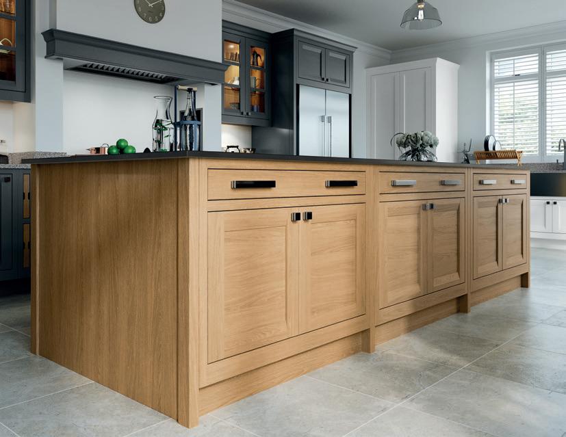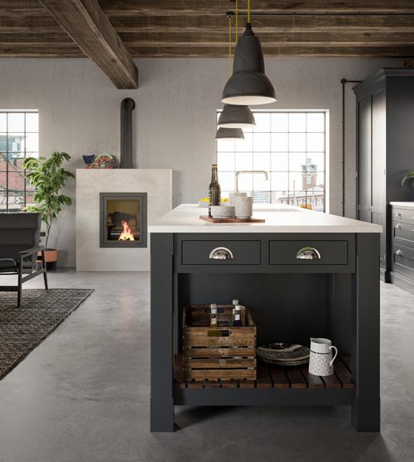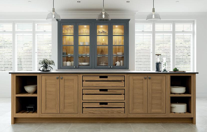 The Peterborough door, with its unique chamfered appearance is punctuated by various accessories ranging from a contemporary style overmantle, open shelving, crate unit drawers and inset oak chopping boards.