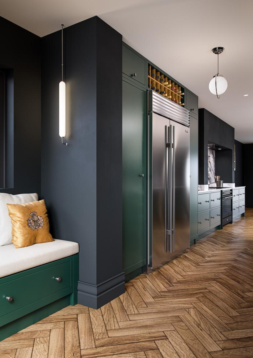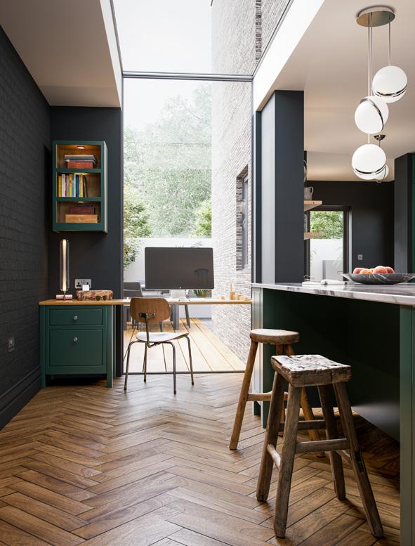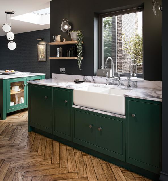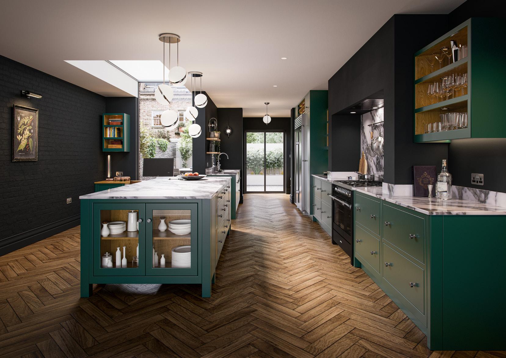 Inject some striking character into the heart of your home with a dark and dramatic kitchen design. Aurora painted Deep Forest combined with graphite walls creates a refined and atmospheric feel which with the right lighting looks far from gloomy.