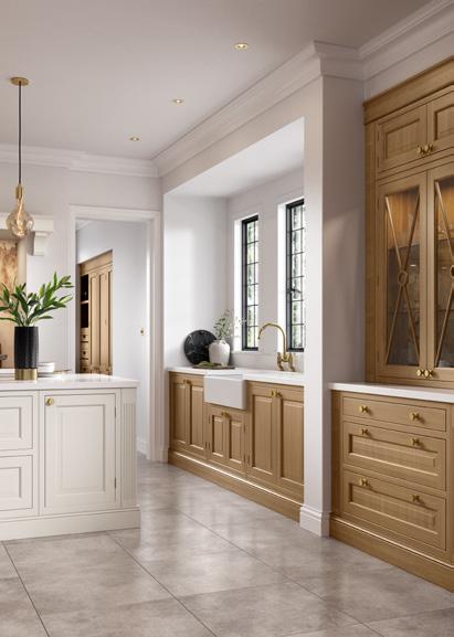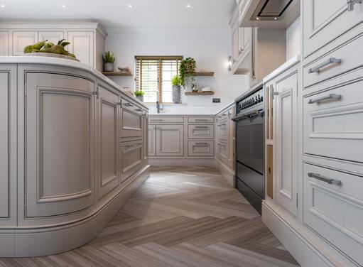 This beautiful Charlotte kitchen painted Cashmere includes an elegant island featuring curved doors and integrated seating. The Oak chopping board and tray units, sloped internal dovetail drawers, coffee station and stunning walk-in pantry demonstrate the perfect fusion of design and functionality.