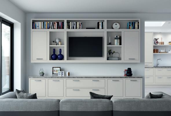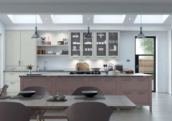 This open plan kitchen and living space features Aurora painted Light Grey, Dust Grey & Vintage Pink with build-in wall units, freestanding island and a combination of glazed frames and open shelves.
