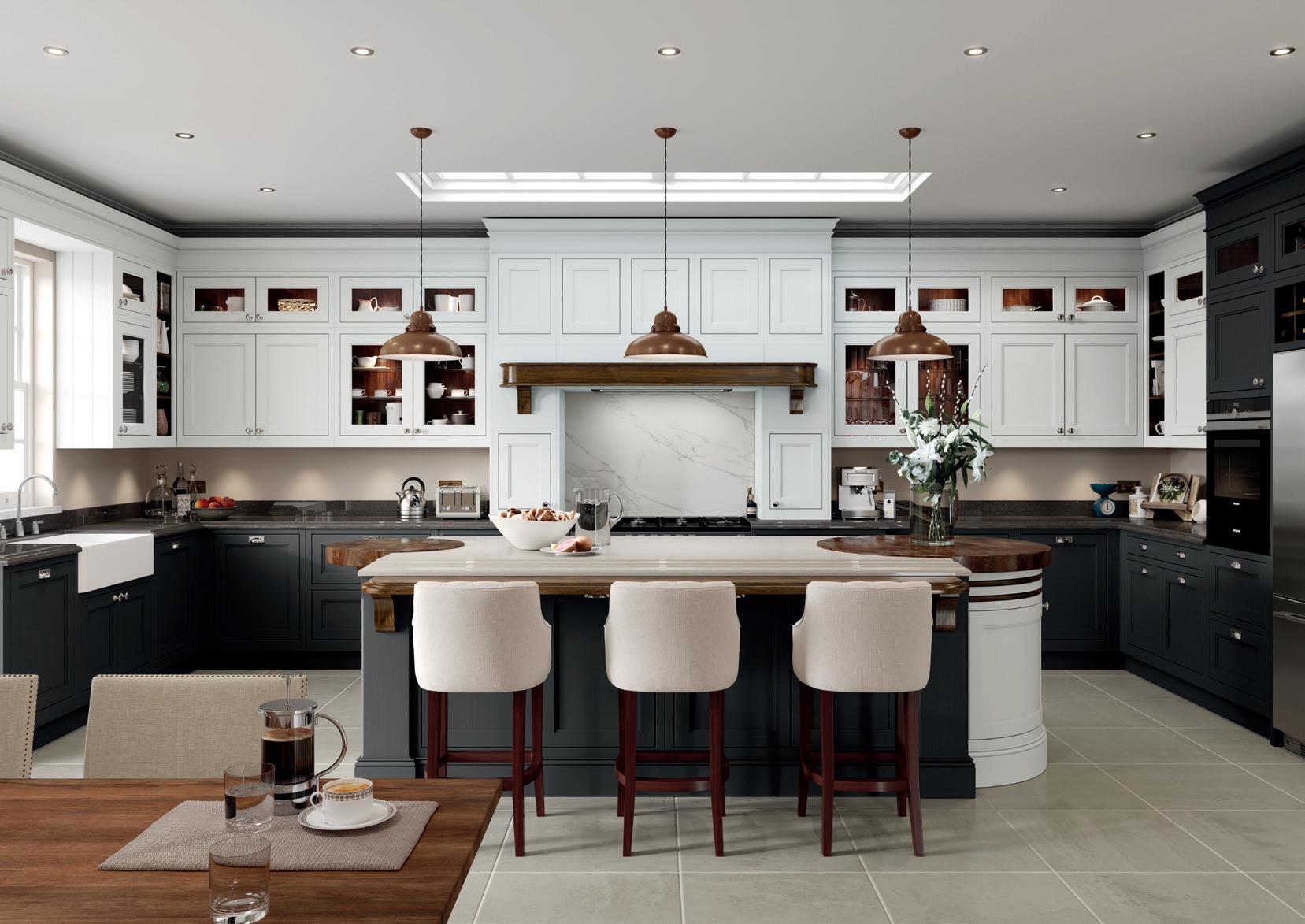The painted island is embellished with a Walnut conical pedestal at one end, and barrel unit with Walnut inset chopping boards at the other end, ideally suited to bustling family life, affording plenty of added space for food preparation. The custom-made breakfast bar is supported by solid Walnut corbals.