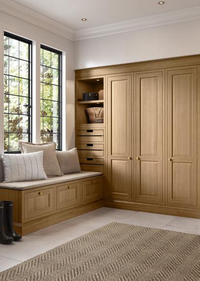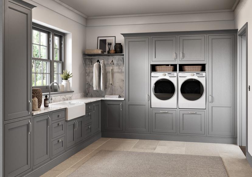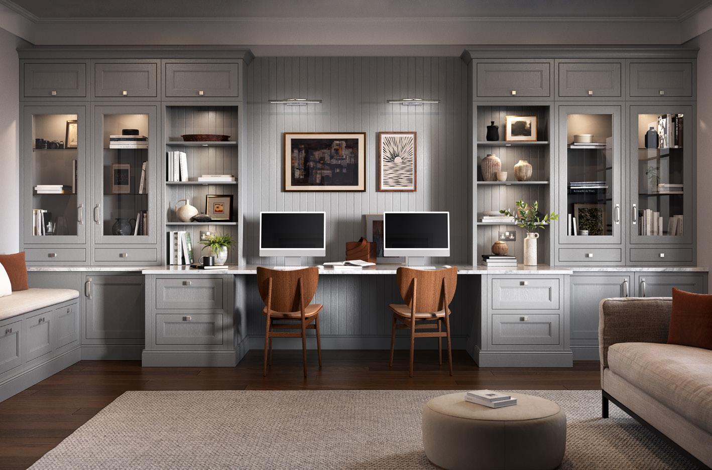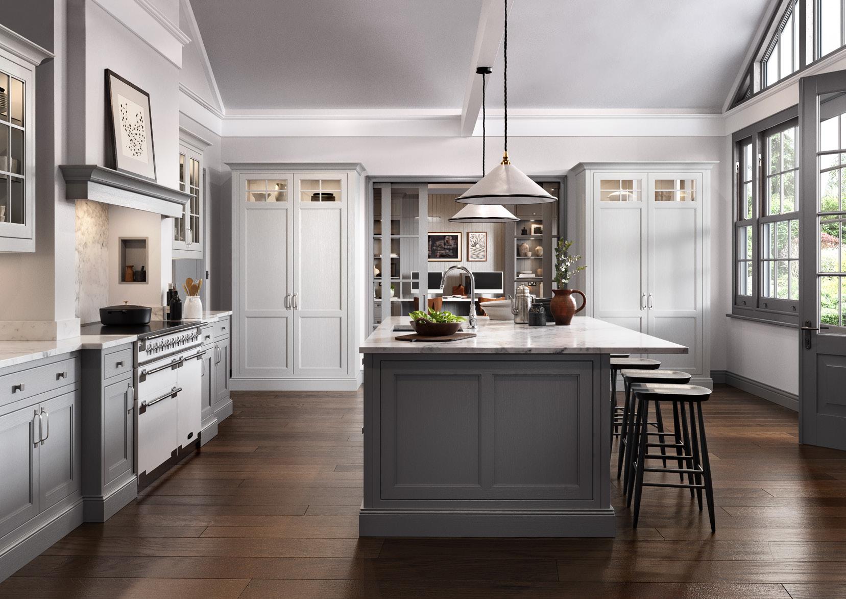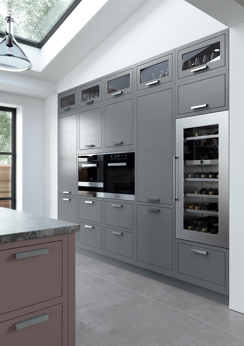 With its sumptuous finish and thoughtful detailing this shaker-style door is given a new twist with a stepped frame around the centre panel. The colour palette of Dust Grey and Light Grey transfers seamlessly through the kitchen, utility and home study in this stunning modern home.