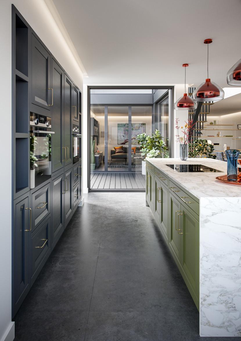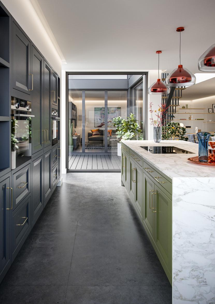 Jasper painted Viridian contrasts beautifully with the White Oak display units and brass handles. This stylish design is enhanced with the dramatic framing of the fridge freezer unit which is also reflected in the stunning dresser unit with bi-fold doors.
