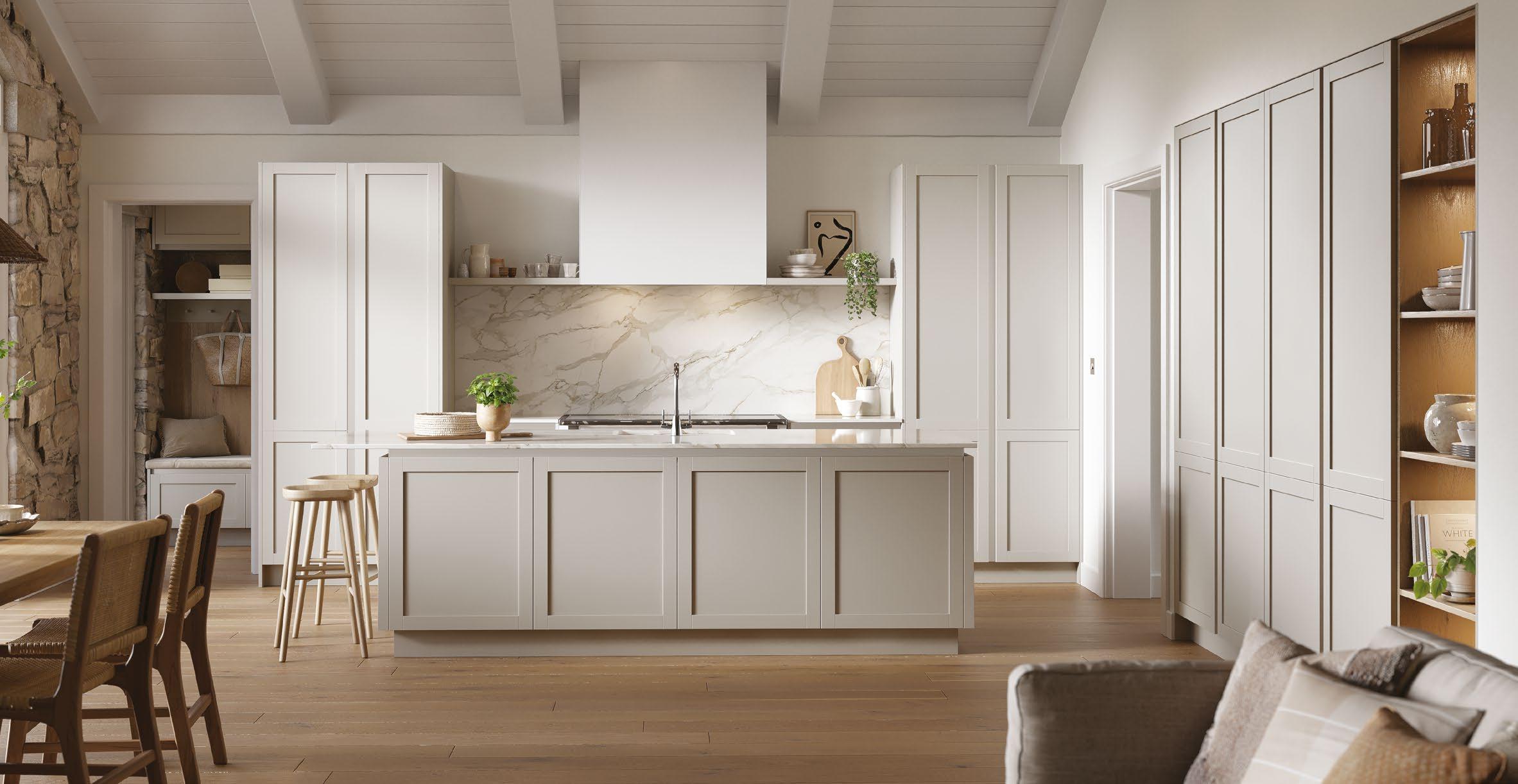 Along with the added distinctiveness of a handleless design, it has a classic, traditional vibe with a contemporary twist. The elegant, muted tones of Sea Mist with light grey profiles add warmth and character to create a cosy, snug atmosphere.