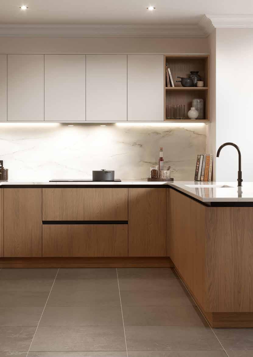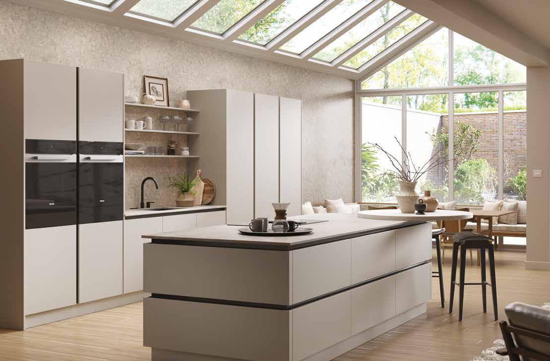 Larger spaces look outstanding in a bright and airy colour scheme. Combine subtle, natural shades and textures to create a warm, relaxed vibe that is effortlessly elegant and refined. Accessorise with charcoal profiles for defined linearity, which displays the streamlined style of the Novus kitchen to perfection.