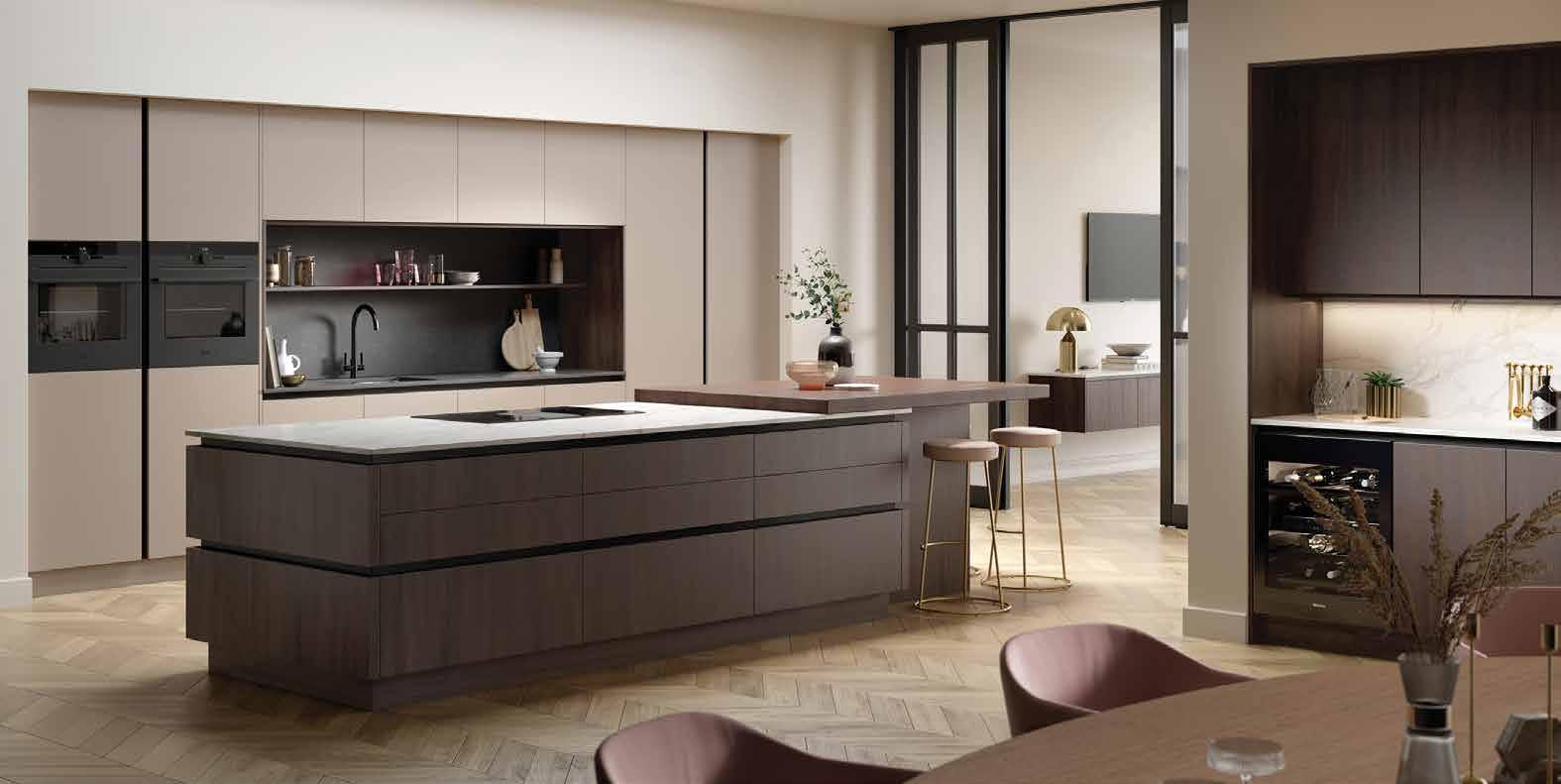 Tall units provide an abundance of storage space to minimise clutter. The restful tones of Dune and Wenge with black profiles create a neutral, but warm backdrop for an elegant and confident style.