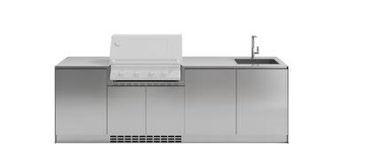 EN L 270,8 cm. 304 delabré stainless steel finish. Composed of internal drawer, four-burner barbecue, in-set sink, and tap. Also available in island version and with sink on the left.