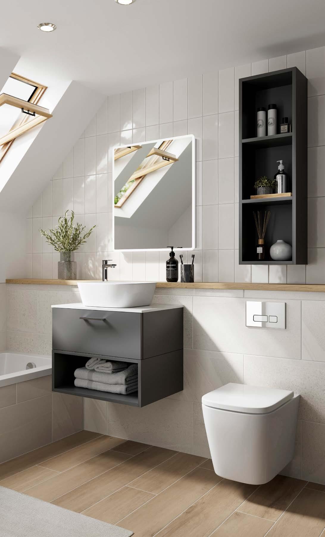 Three of our popular colours are now available as basins - Matt Antique Rose, Matt Parisian Blue & Stone Matt. The distinctive curves of the basin contrast stylishly with the inset, geometric lines of the white units.