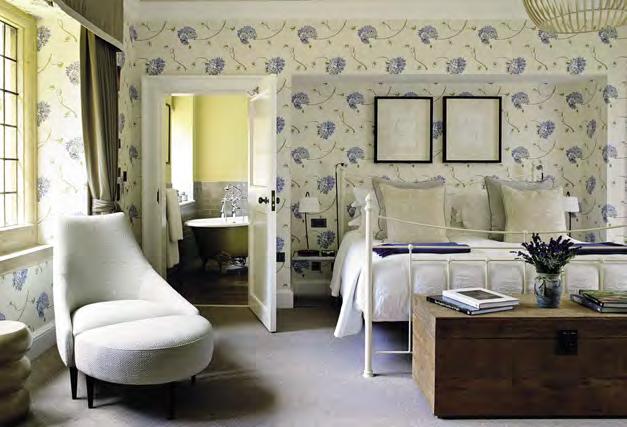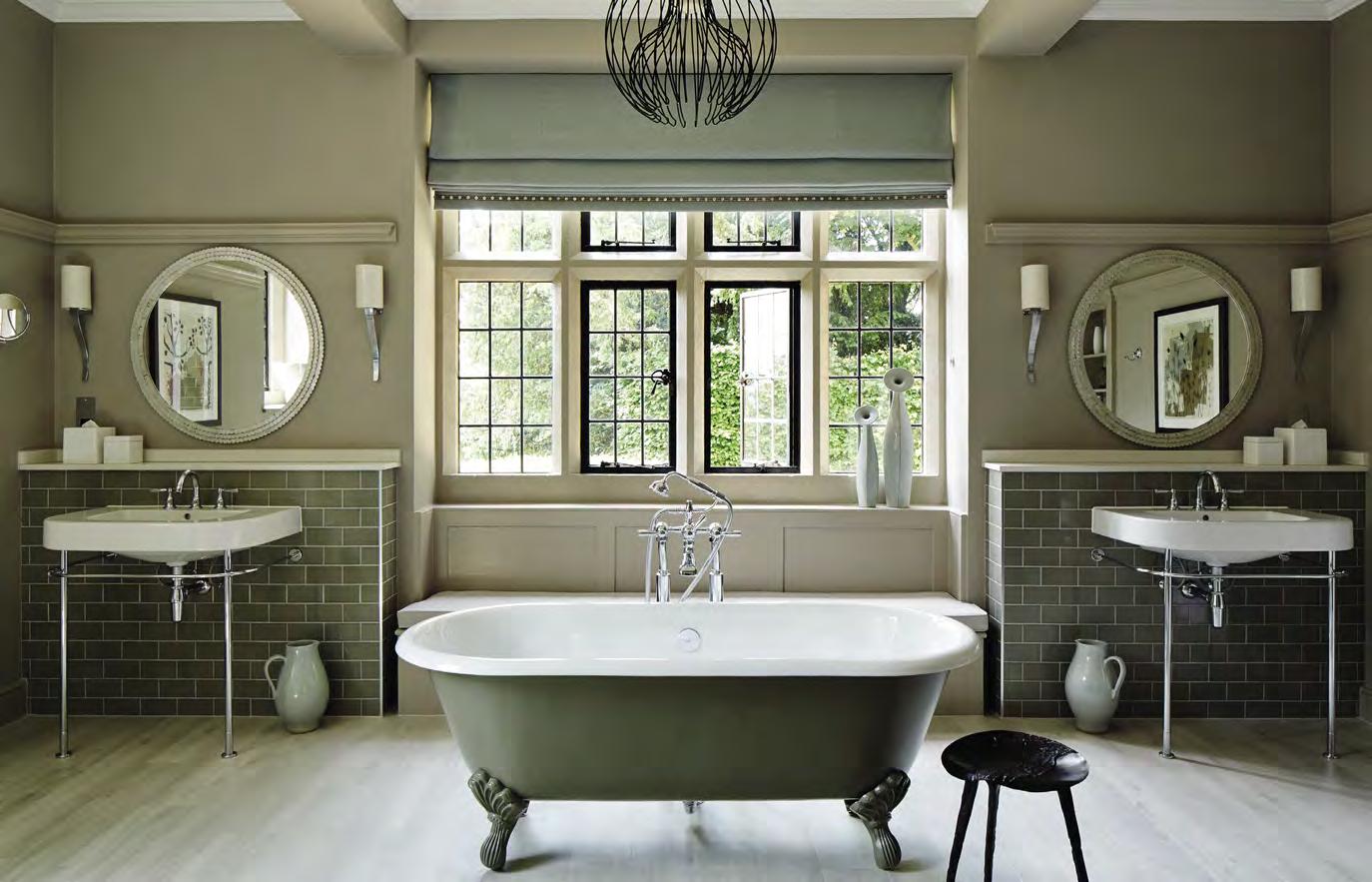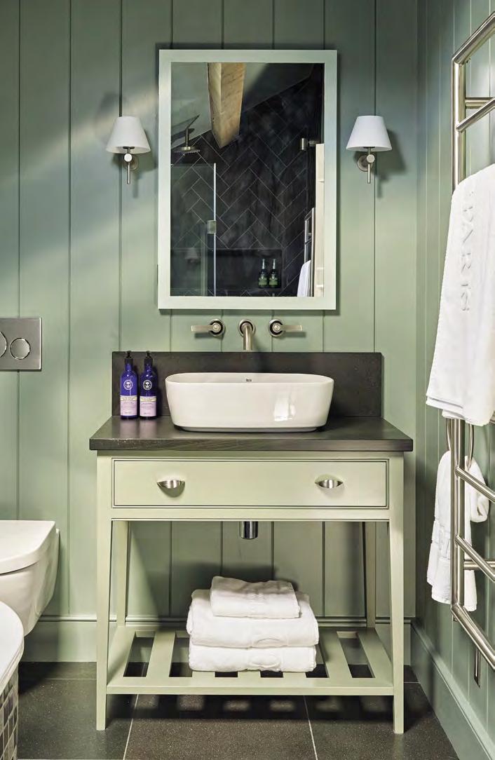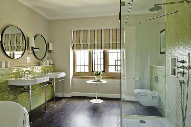 The traditional green country interior of Foxhill Manor in Broadway in the Cotswolds draws the outdoors in with harmonious shades of green and hints of blue. Accessorised with traditional Fairfield brass fixtures by Samuel Heath.
