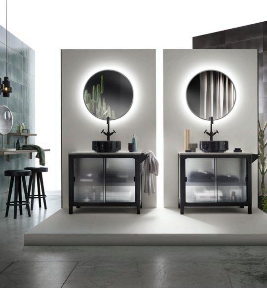Kompositionsblöcke und Materialien, die das Bad mit Elementen aus der Küche verbinden, insbesondere mit der Kollektion der freistehenden Elemente Misfits, die zum ikonischen Leitmotiv wird.