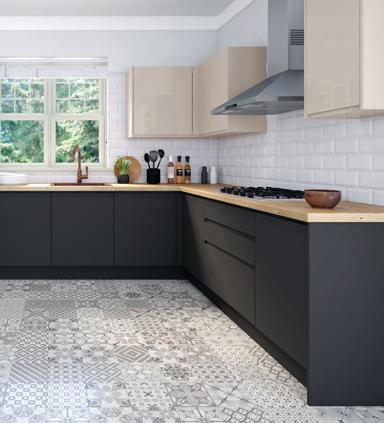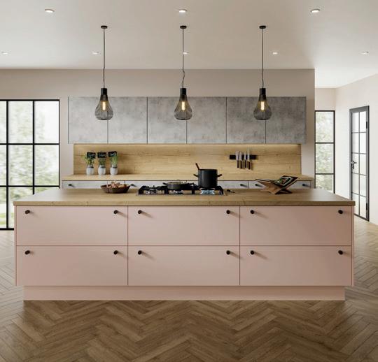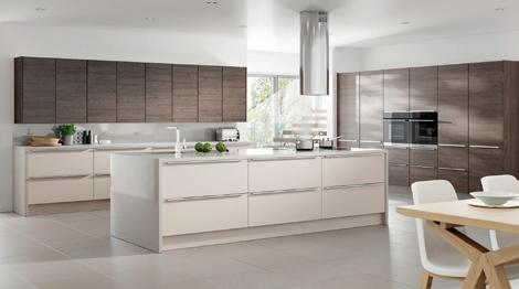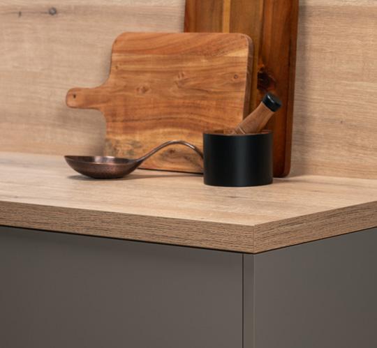 Solid colours such as Cashmere and Light Grey work brilliantly with the striking woodgrain textured décors of Brown Orleans Oak and Cascina Pine. Alternatively combine two different textured and coloured fascias with the cooler light grey tones of a square-edged worktop, or a glossy marble finish splashback.