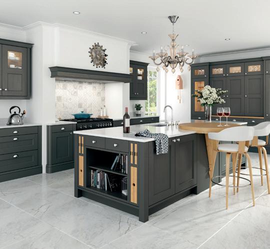 You’d be surprised. Certainly, Colmar features the 5-piece, solid-framed flat-panelled door in solid, 20mm-thick oak or ash as you’d expect, the brushed painted finish giving a greater depth of grain to add to its ageless beauty. But it also offers a myriad of possibilities with glazed doors, curved ends and open shelving.