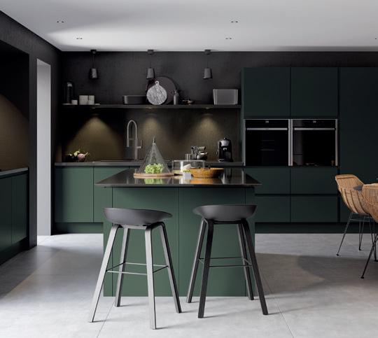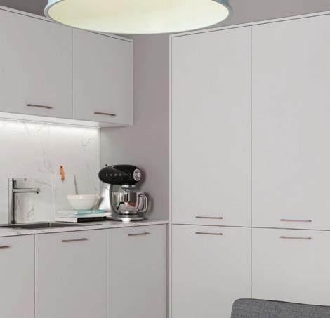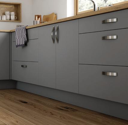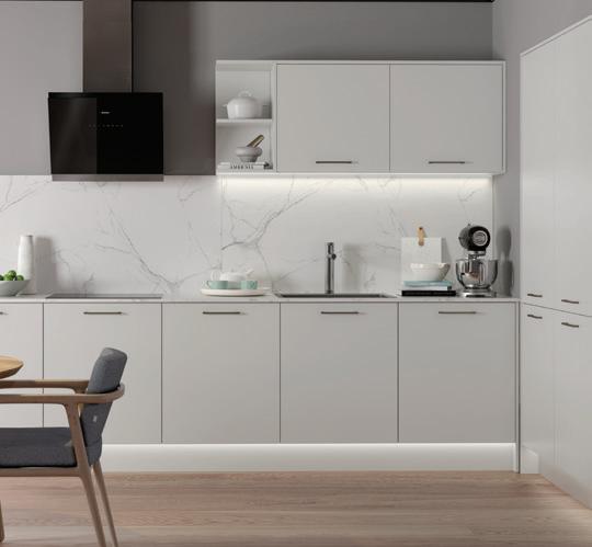 A contemporary slab door in soft touch matt that brings simplicity and serenity to the chaos of any kitchen.