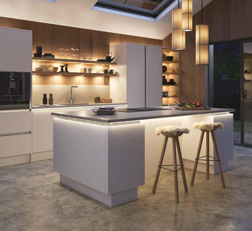 Sufficient lighting is a must in task based areas where hobs, sinks and even worktops are in use, as this aids safe cooking, washing and prepping. A range of LED options are available in aluminium and an on-trend matte black finish.