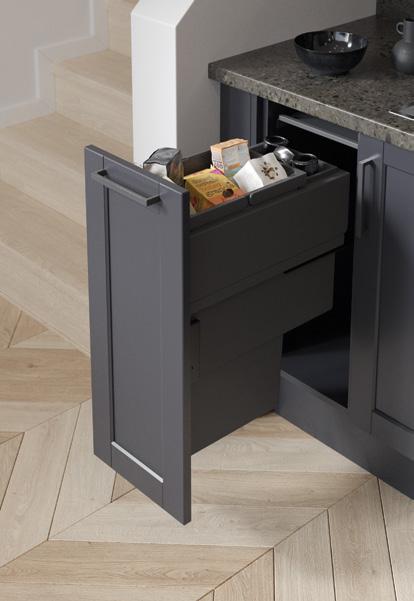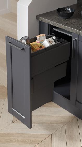 Awkward, dark corners can be solved with the VS CORNERSTONE® Maxx corner pull-out while the VS TAL® Larder can easily store an abundance of everyday food items for ease of access. A VS ENVI® Space XX Pro S integrated bin is an ideal way for concealing everyday household waste.