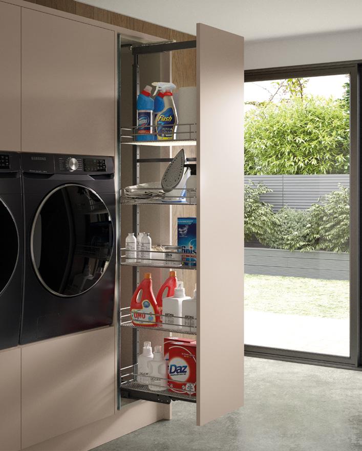 The VS TAL® Gate pull-out larder provides maximum storage and easy access where one pull reveals the entire contents of the cabinet.