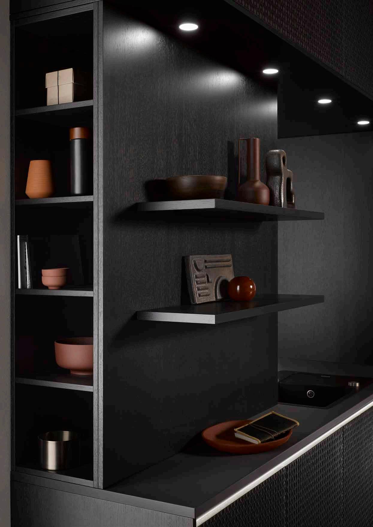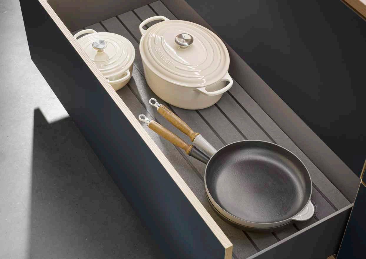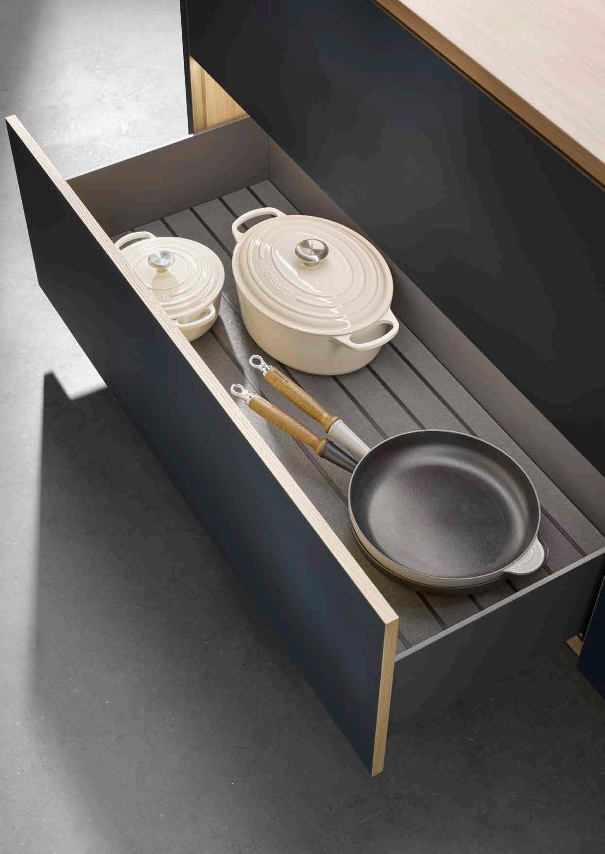 The high-quality SLD pull-out unit with a frame measuring just eight millimetres is a real design element in the kitchen and usually receives too little attention. This is why it is combined here with integrated lighting and the new OrganiQ interior organisation system. The integrated interior lighting of the pull-out unit ensures optimum visibility even in the rearmost compartments. A clever aid for finding specific items or selecting the right cutlery. The real wood interior organisation gives the kitchen even more exclusivity and ensures tidy and stylish storage.
