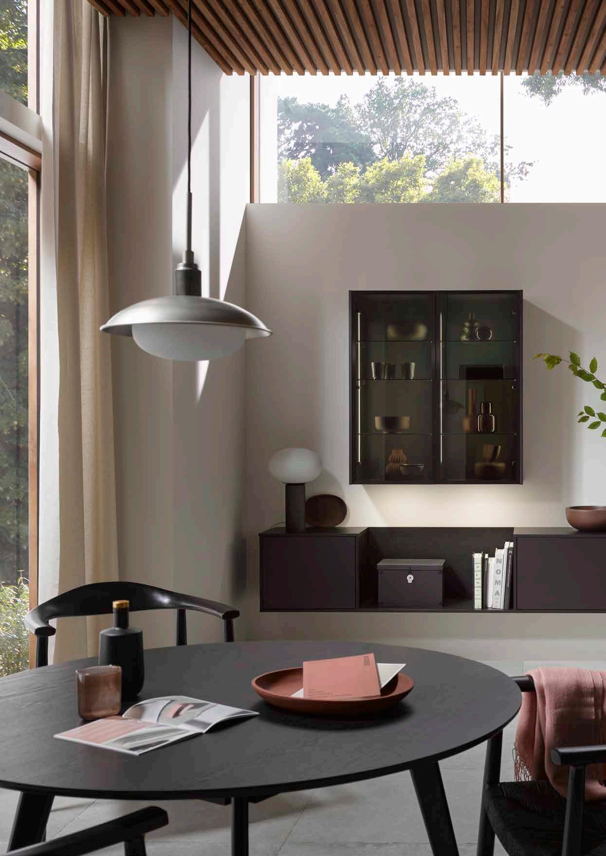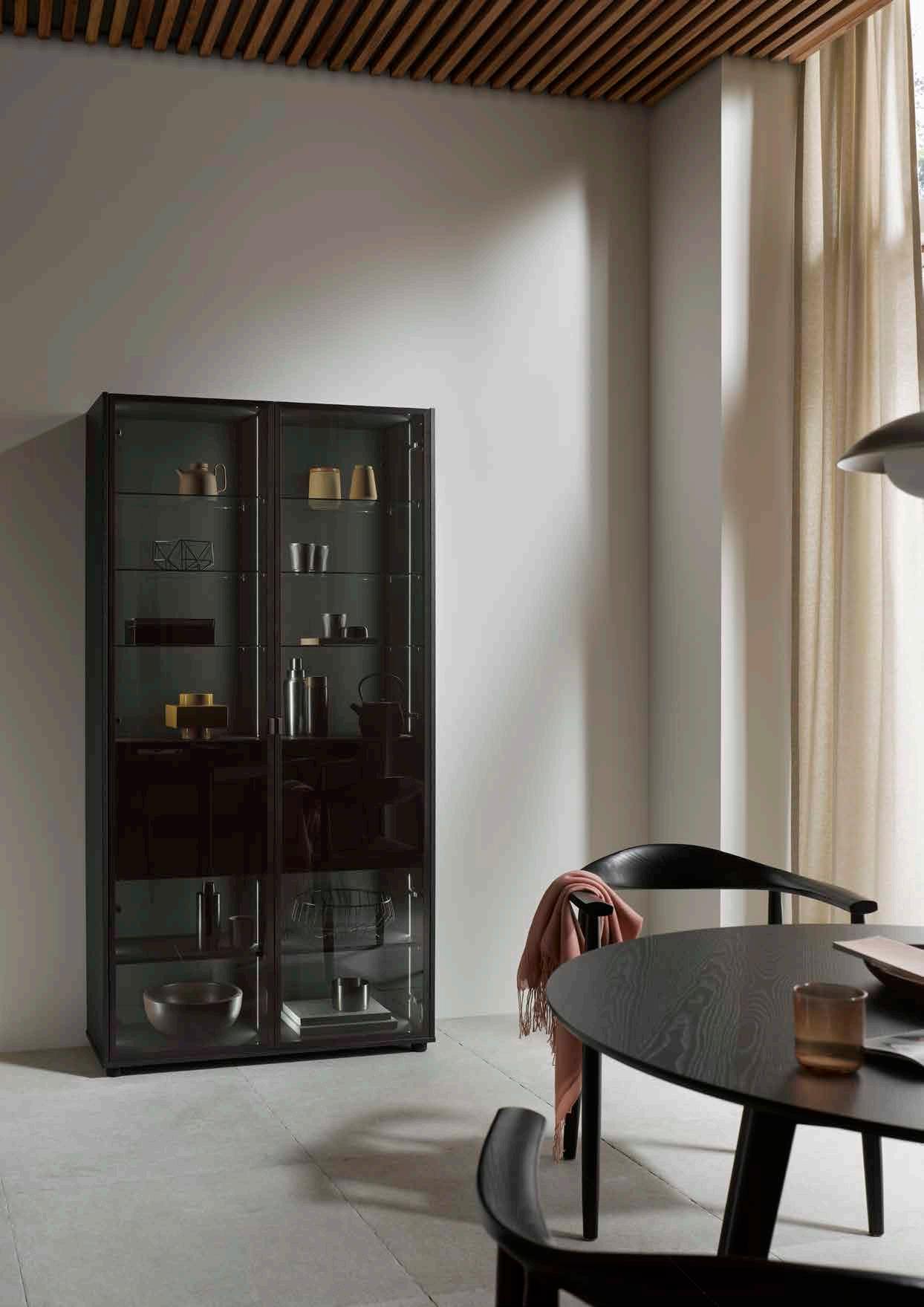 Det eleganta vitrinskåpet med Parsol-glas och smal metallram i grafit sätter stilfulla accenter i alla rum. Det tonade glaset och den dämpade belysningen gör att samlarobjekt och prydnadsföremål ser ut som om de har mjukfokuserats. De filigrana ramarna skapar en modern, minimalistisk estetik. En mittpunkt för exklusivt boende.