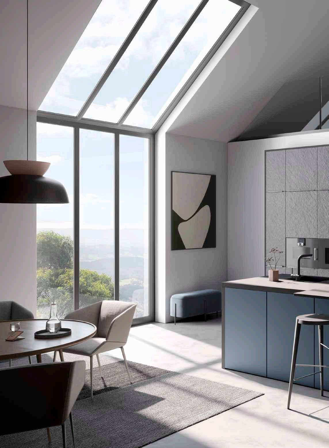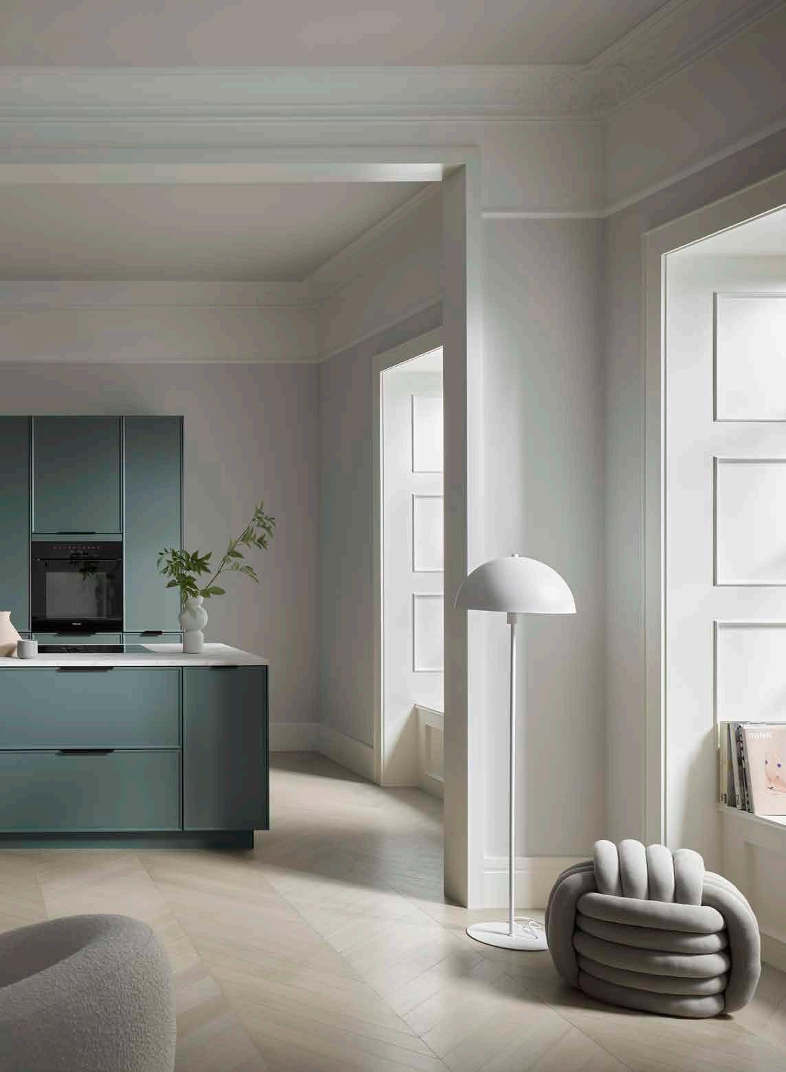 A modern kitchen with linoleum fronts combines innovative design with sustainable elegance. The natural materials give it an inviting atmosphere. The surface feels pleasantly soft and warm, while the matt look gives this kitchen a perfect radiance. Linoleum in stylish colour combinations sets an example for sustainable elegance and contemporary living aesthetics.
