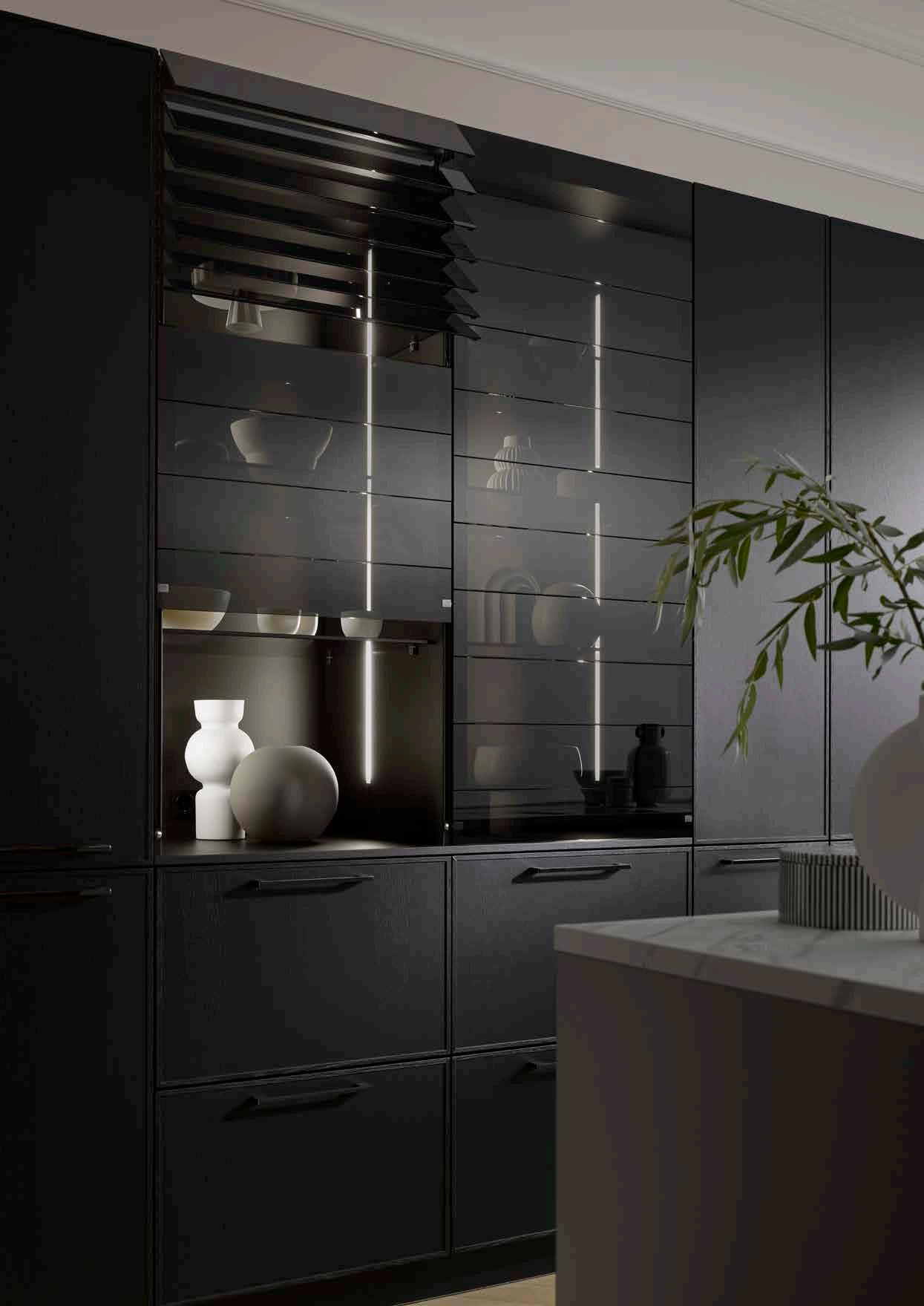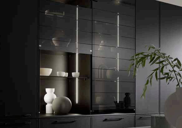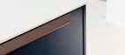 Det högkvalitativa SLD-utdragssystemet med en ram som bara mäter åtta millimeter är ett riktigt designelement i köket och får vanligtvis för lite uppmärksamhet. Därför kombineras det här med integrerad belysning och det nya inredningssystemet OrganiQ. Den integrerade interiörbelysningen i utdragsskåpet ger optimal sikt även in i de bakre facken. Ett smart hjälpmedel för att hitta specifika artiklar eller välja rätt bestick. Inredningen i äkta trä gör köket ännu mer exklusivt och ger en snygg och stilren förvaring.