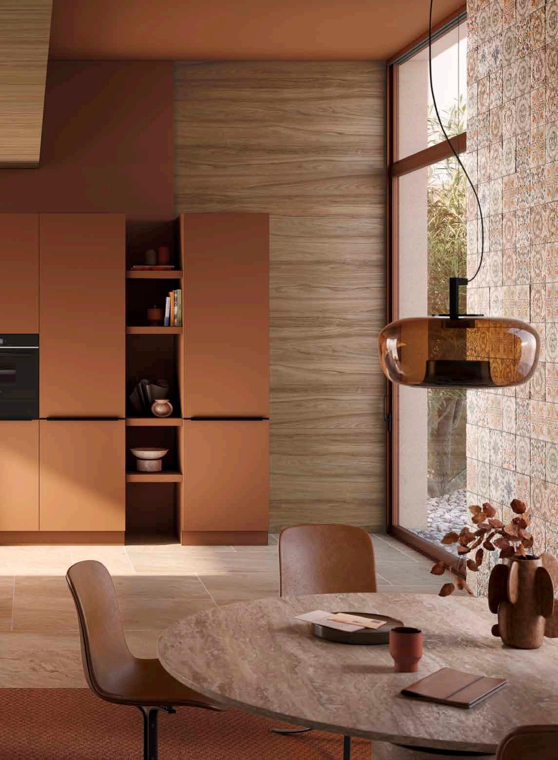 Atmosfera mediterranea: la colonna laccata opaca color terracotta domina l'ambiente e si mette magistralmente al centro della scena. Il colore delle pareti nella stessa tonalità enfatizza la sua solarità. L'isola in bianco cristallo in robusto laminato dal design minimalista aggiunge un tocco di freschezza. Una cucina invitante, esteticamente gradevole e pratica, ideale per gli individualisti attenti allo stile.