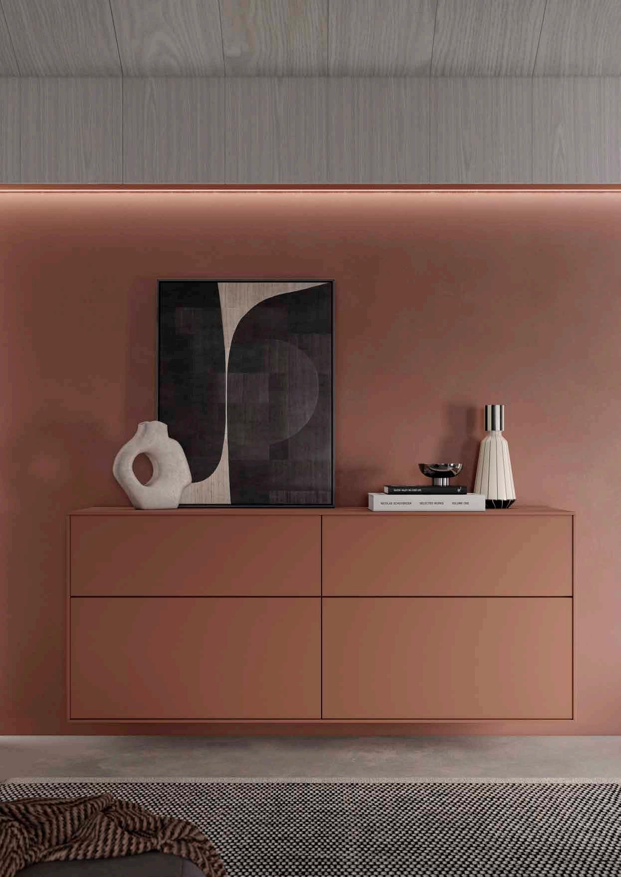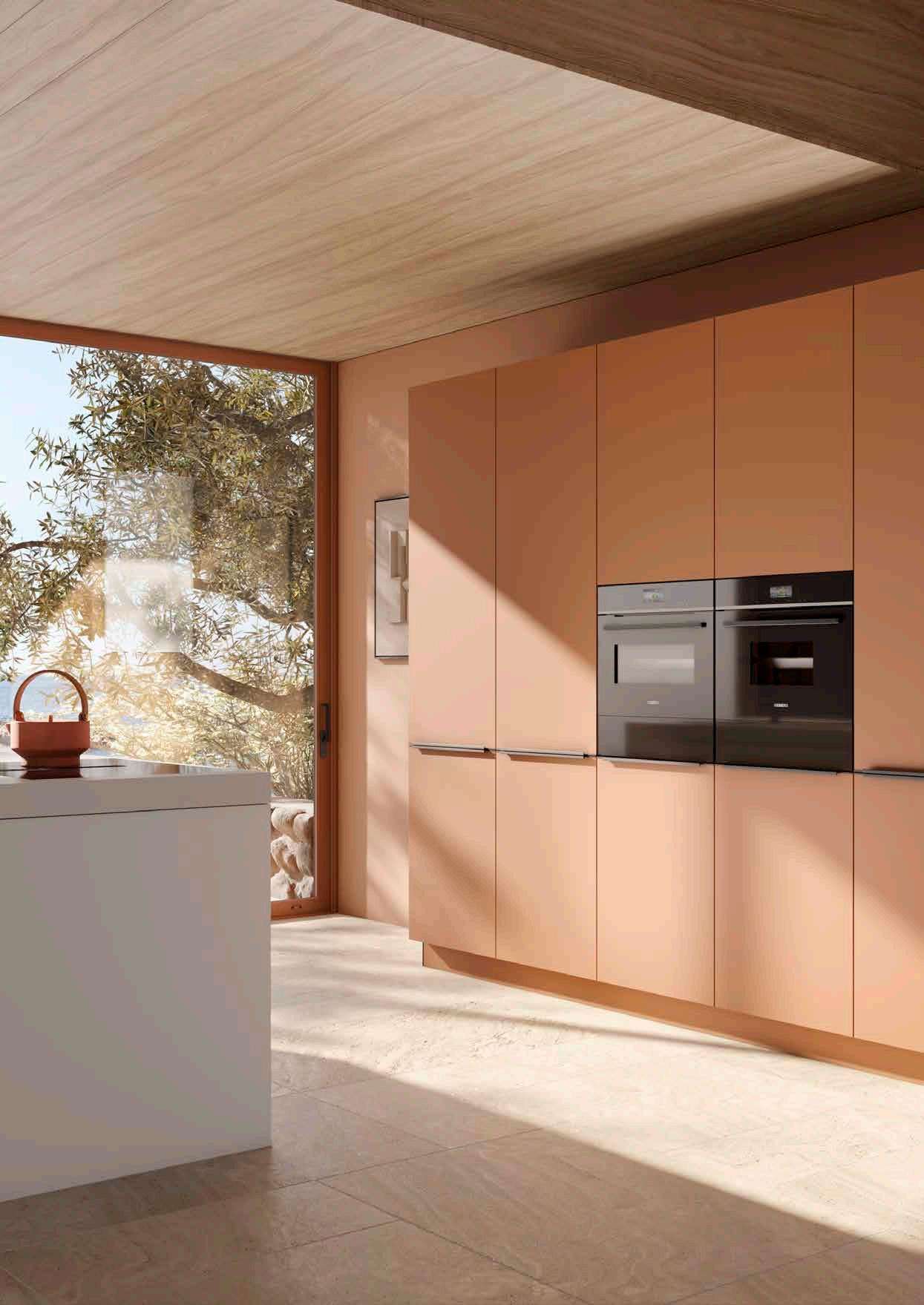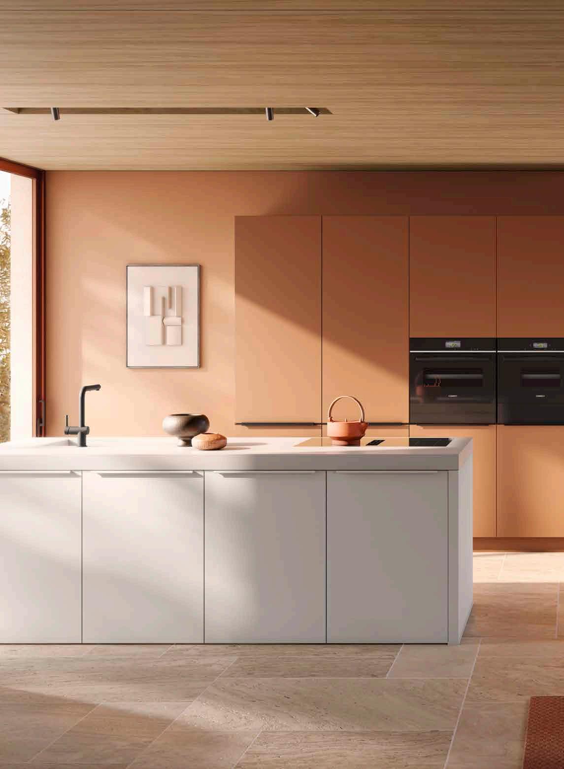 Ambience like in the south: the matt lacquered tall cupboard run in terracotta dominates the room and skilfully sets the scene. The wall colour in the same shade emphasises the sunny look. The crystal white kitchen island, made from durable laminate, in a minimalist design creates a fresh accent. An inviting kitchen that is both aesthetically pleasing and practical – ideal for styleconscious individualists.