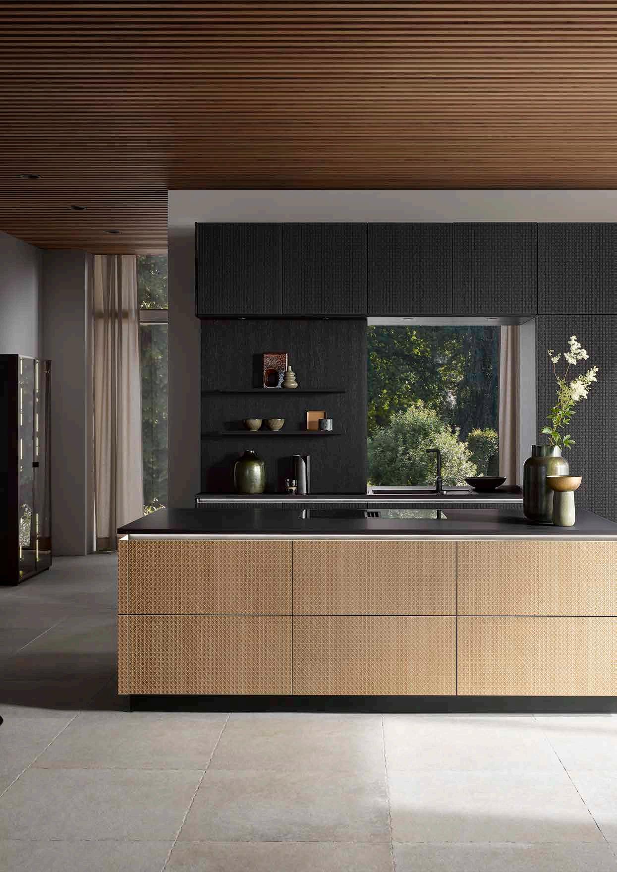 A special kitchen that combines traditional craftsmanship with modern design in a fascinating manner. The Viennese weave lends the fronts a nostalgic touch, while the clear lines and matt illuminated mouldings stand for contemporary elegance. Reminiscent of times gone by: The integrated hatch provides an unobstructed view of nature. A masterpiece of stylish kitchen architecture. Another special feature here: the 61 cm deep carcase offers plenty of space in the pull-out unit.