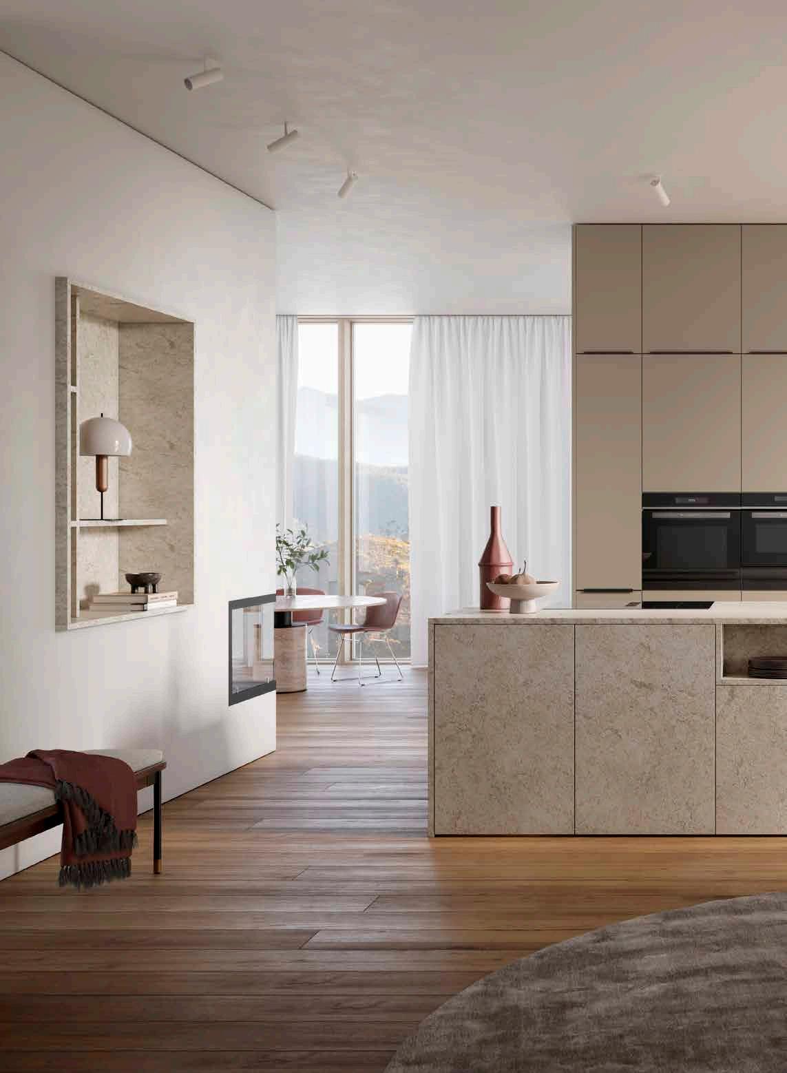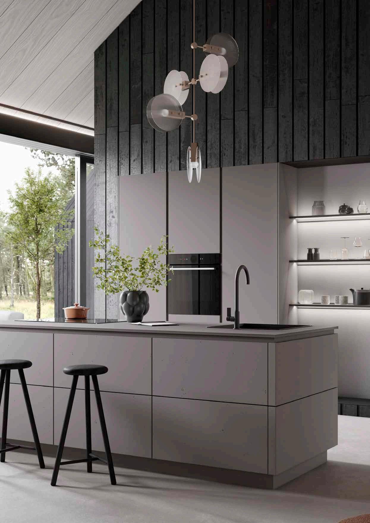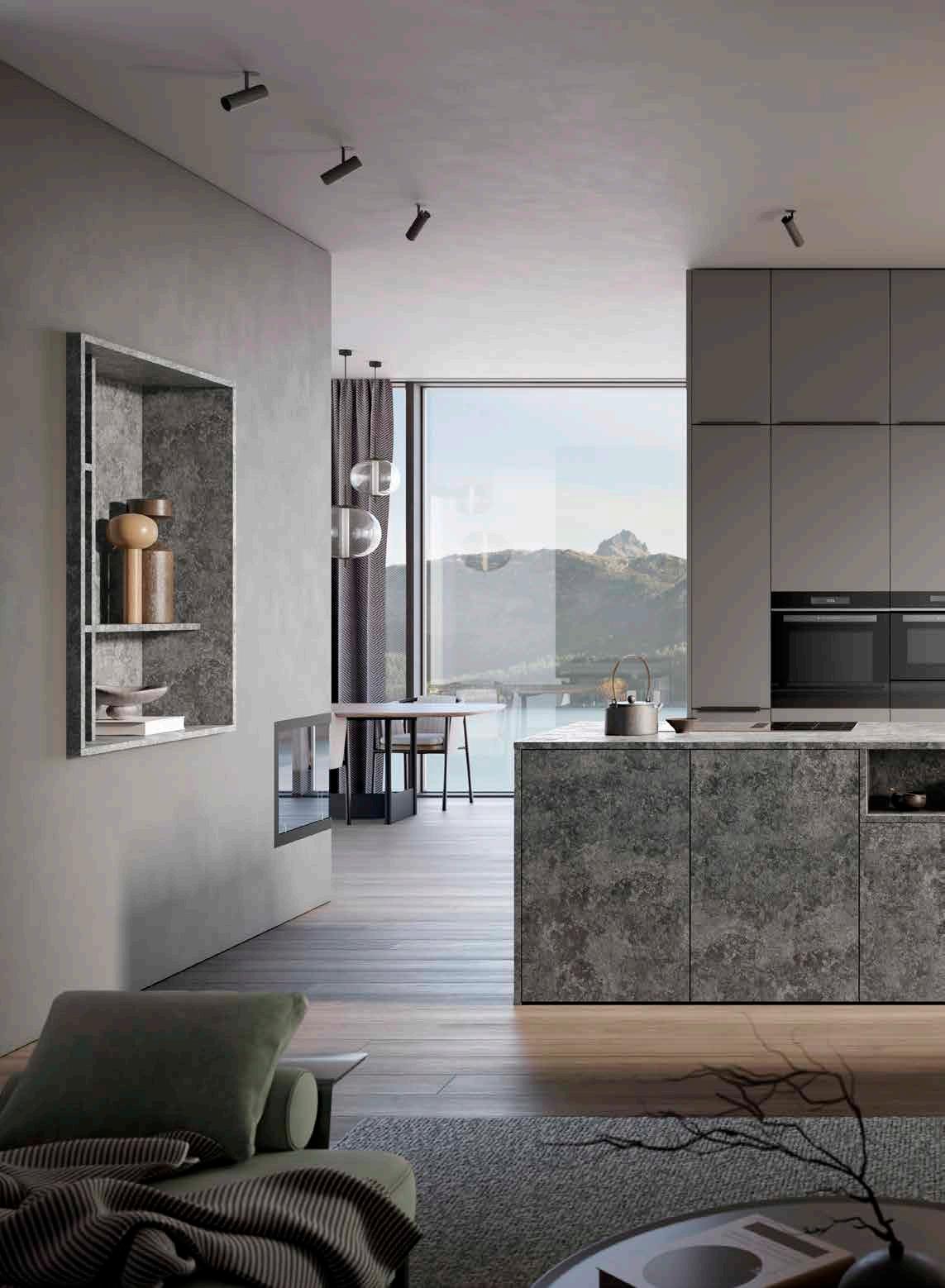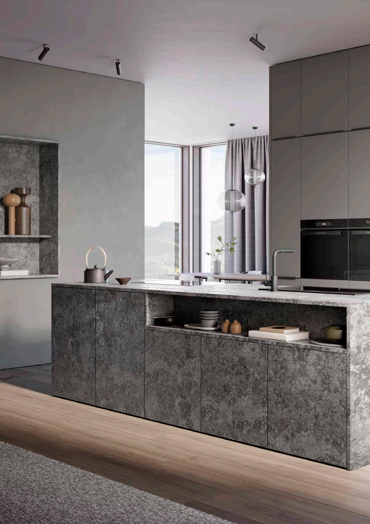 Calcestruzzo e cemento possono essere inseriti nei progetti di cucine come nota decorativa in vari modi, conferendo a top, ante, pavimenti e pareti un carattere moderno e industriale. Grazie alla loro robustezza e durata, questi materiali sono ideali per le superfici soggette ad un uso intenso. È possibile utilizzare texture e colori diversi per creare design unici e personalizzati che uniscono funzionalità e stile.
