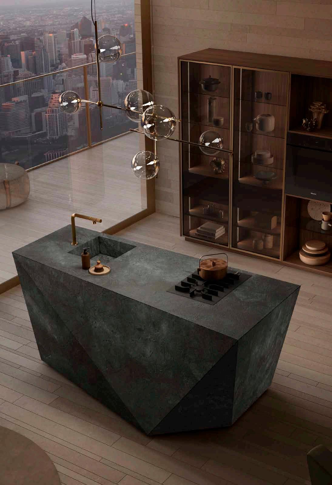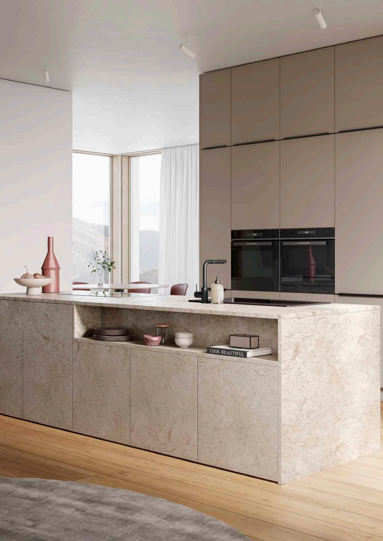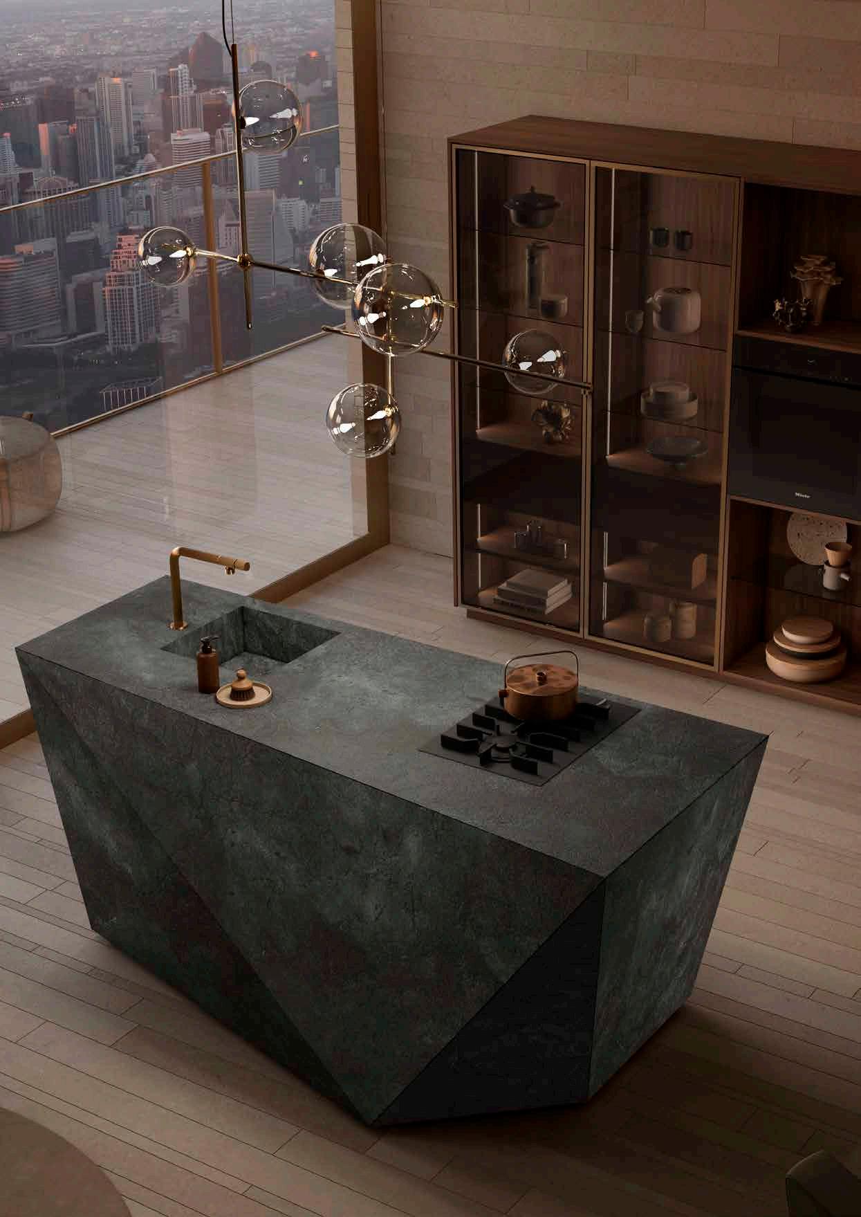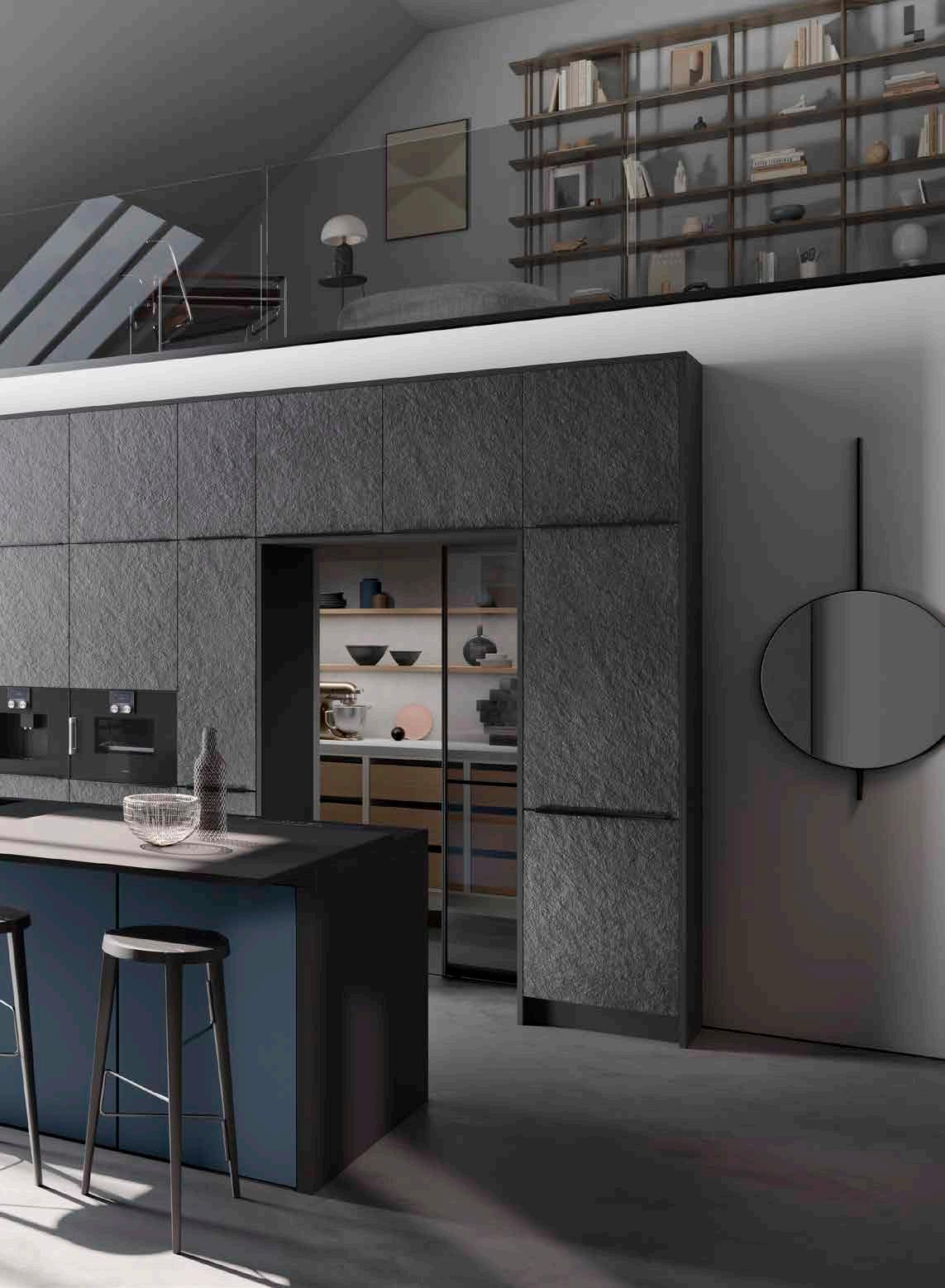 Calcestruzzo e cemento possono essere inseriti nei progetti di cucine come nota decorativa in vari modi, conferendo a top, ante, pavimenti e pareti un carattere moderno e industriale. Grazie alla loro robustezza e durata, questi materiali sono ideali per le superfici soggette ad un uso intenso. È possibile utilizzare texture e colori diversi per creare design unici e personalizzati che uniscono funzionalità e stile.
