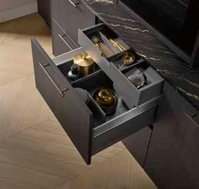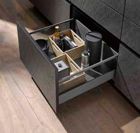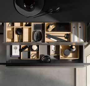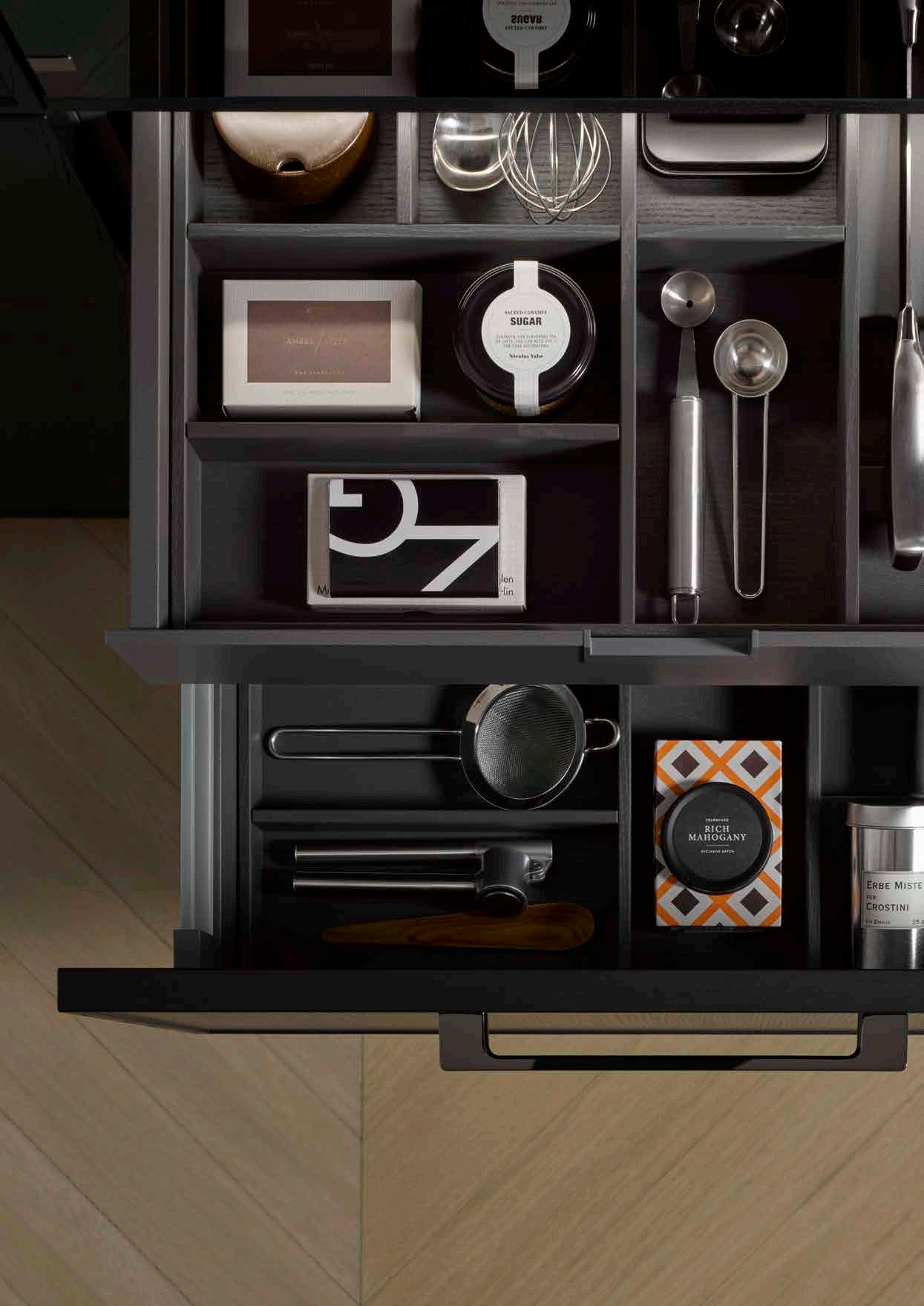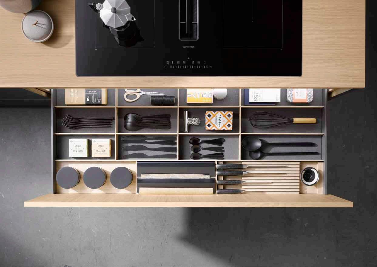 L'esclusiva ferramenta per cassetti SLD, con sponde di spessore di soli otto millimetri, è un vero e proprio elemento di design in cucina, che solitamente desta poca attenzione. Per questo motivo è stato abbinato al sistema di illuminazione integrata e al nuovo organizer interno OrganiQ. L'illuminazione interna integrata del cassetto garantisce una visibilità ottimale anche nei vani più nascosti. Una soluzione intelligente per trovare oggetti specifici o per scegliere le posate giuste. L'organizer interno in vero legno conferisce alla cucina la massima esclusività e permette di sistemare gli oggetti in modo ordinato ed elegante.
