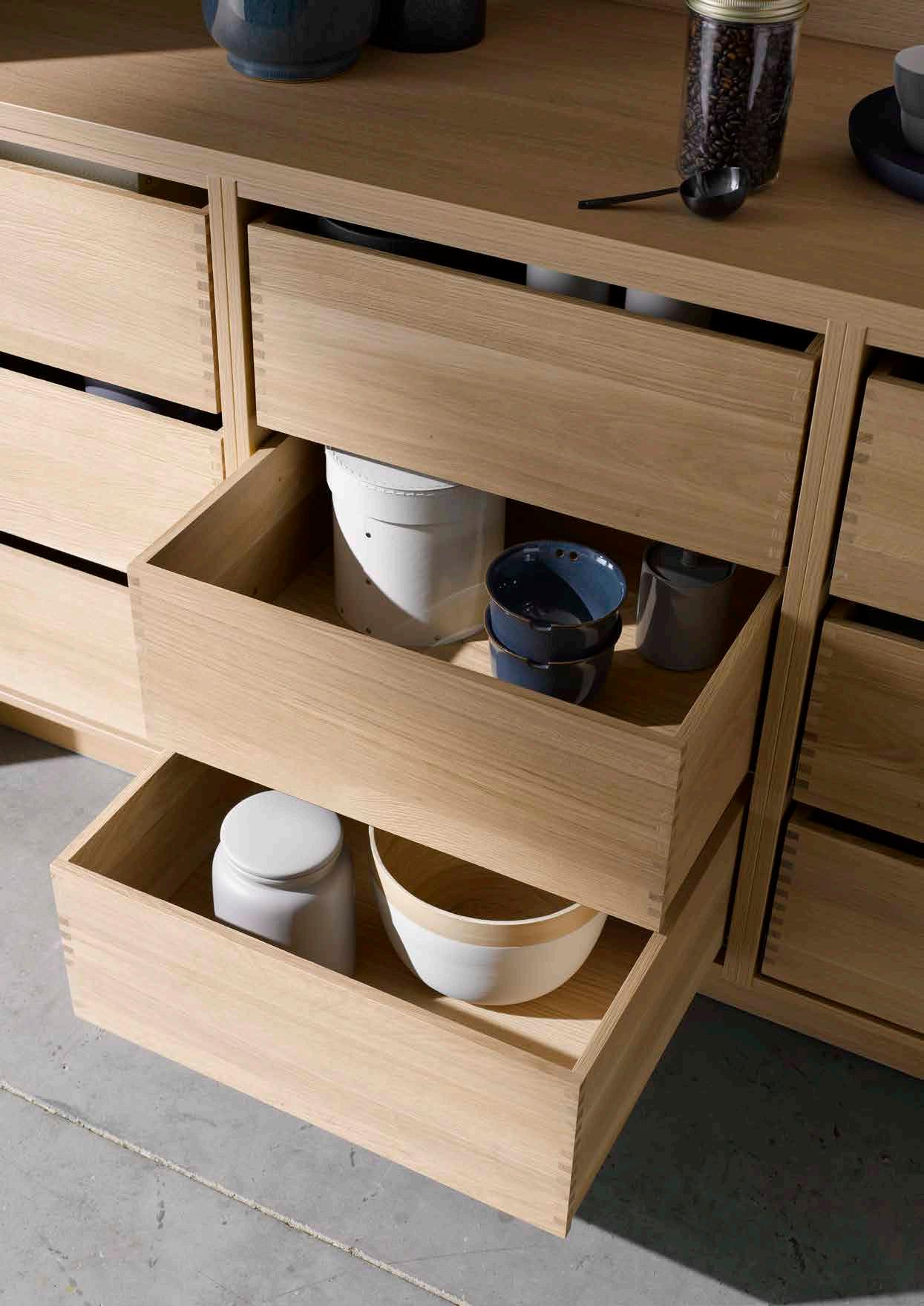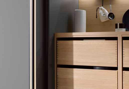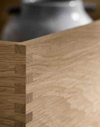 The box joint, solid wood pull-out units combine classic craftsmanship with modern functionality. Precisely machined notches ensure durability and stability. They also look extremely decorative. Fine solid wood gives the cupboard interior an elegant look, while the careful workmanship guarantees the highest quality. An excellent choice for anyone who values stylish and sustainable interior design.